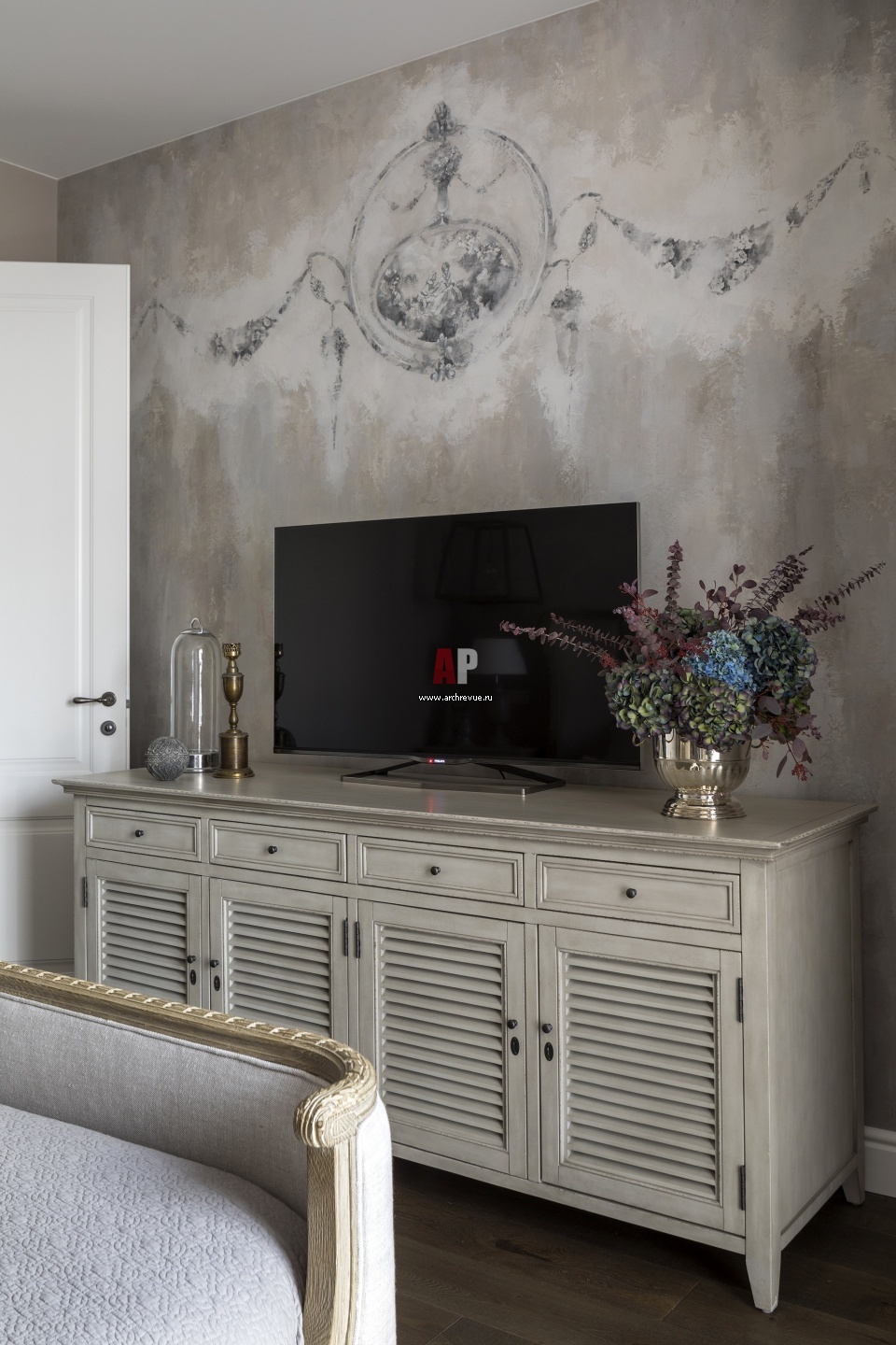 Семейная квартира под старину в монолитном доме. Интерьер спальни с настенной художественной росписью.