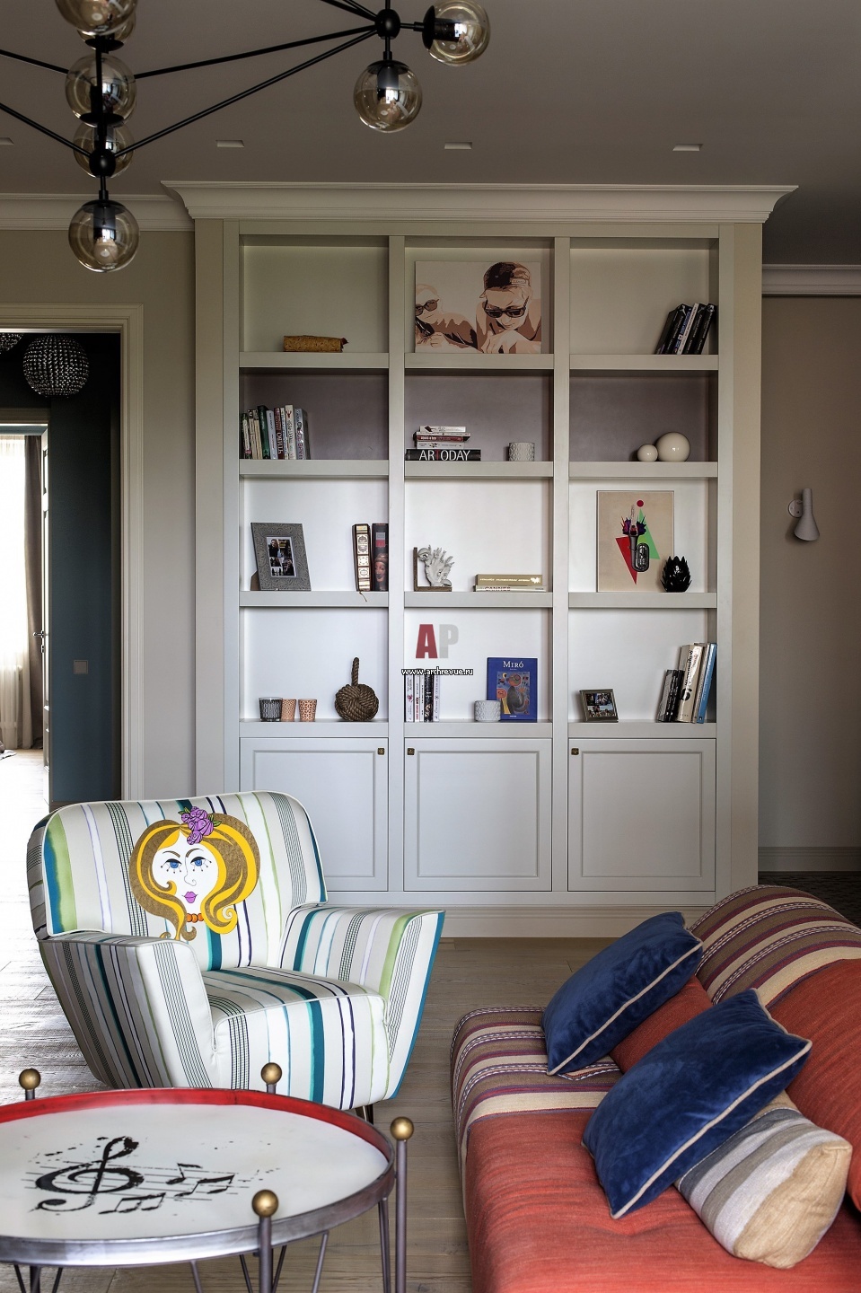 Декоративный встроенный шкаф в гостиной выполнен по эскизам архитектора. Глубина полок в нем составляет 38 см, нижняя часть оснащена дверцами. Шкаф, МДФ с покраской, изготовление «Столичная Столярная Компания», «Бесст». Сверху шкаф стыкуется с потолочным карнизом, что придает ему классические черты. Потолочные карнизы Orac Decor, поставщик «Ампир Декор».