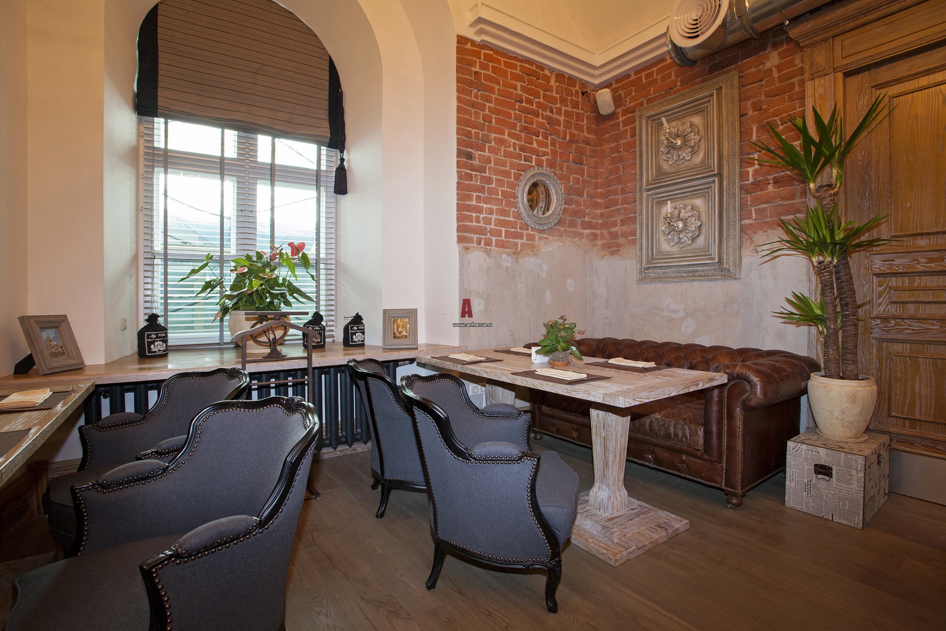 Фото интерьера зоны отдыха с кожаными диванами. Цветочные кадки выполнены на заказ в мастерской Beni.