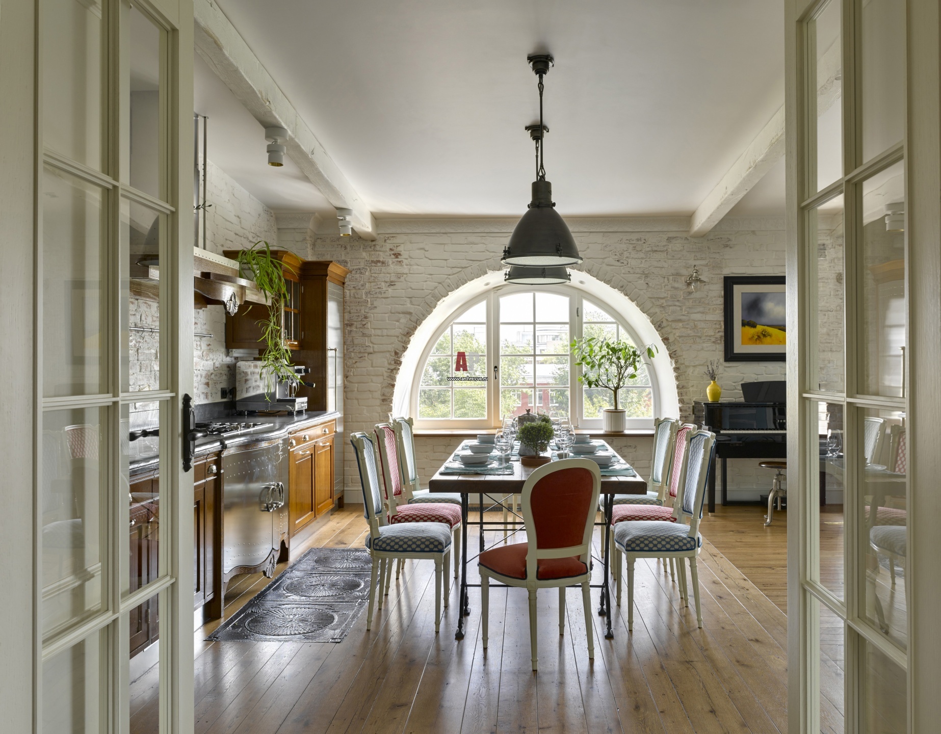 Двухэтажная квартира в стиле фьюжн на Саввинской набережной. Кирпичные стены частично «родные», частично воссозданные. На полу – дубовая доска.
