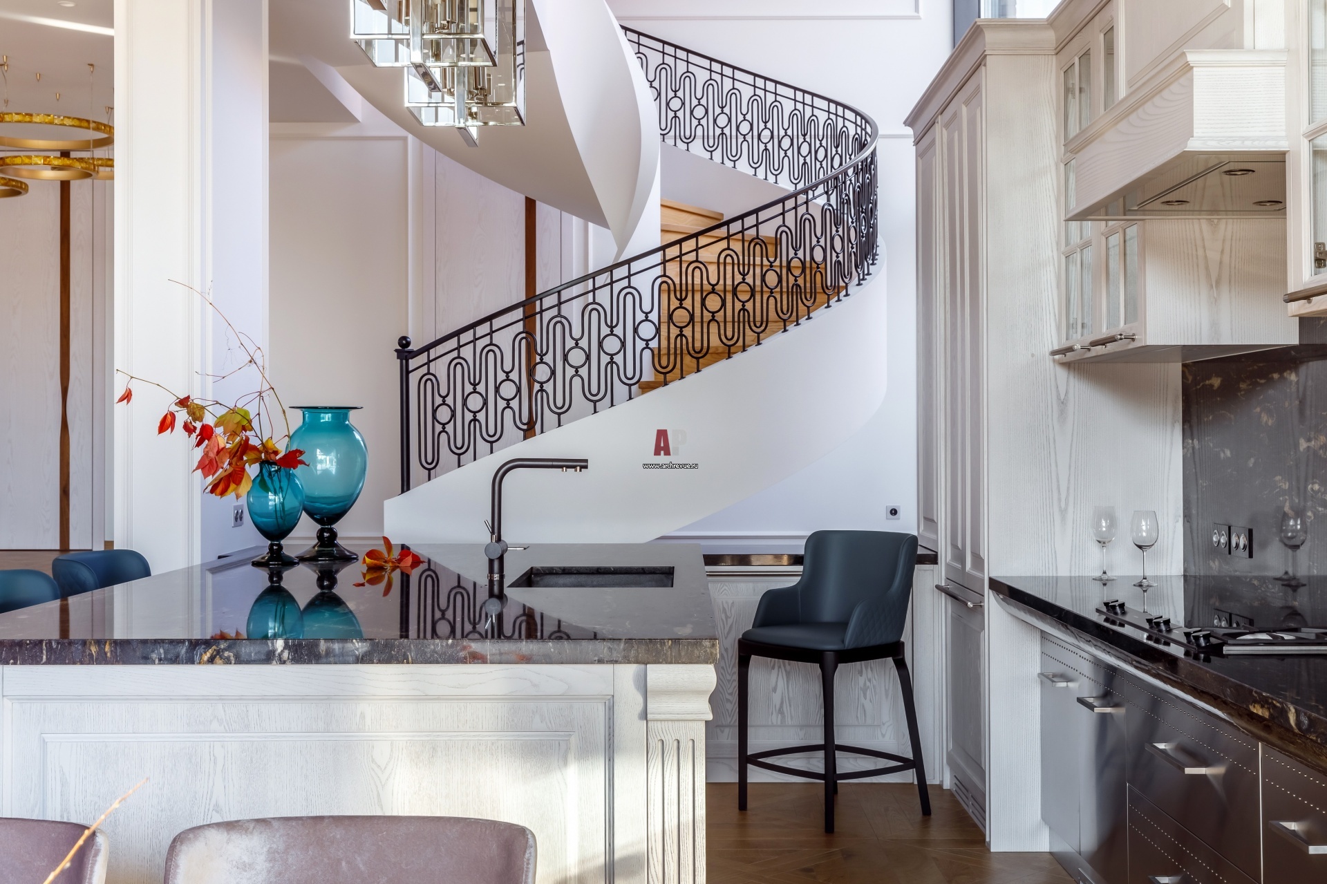 Светлый дом для большой семьи. Вид из кухни на лестницу.