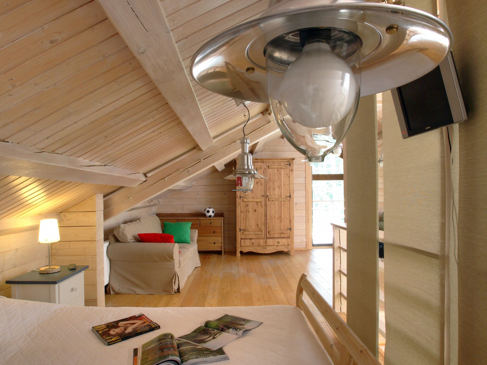 Антресоль, общественную зону и веранду освещают потолочные светильники IKEA, похожие на перевернутые свечи в подсвечниках. В спальне они размещены довольно низко, что создает интересный декоративный эффект.