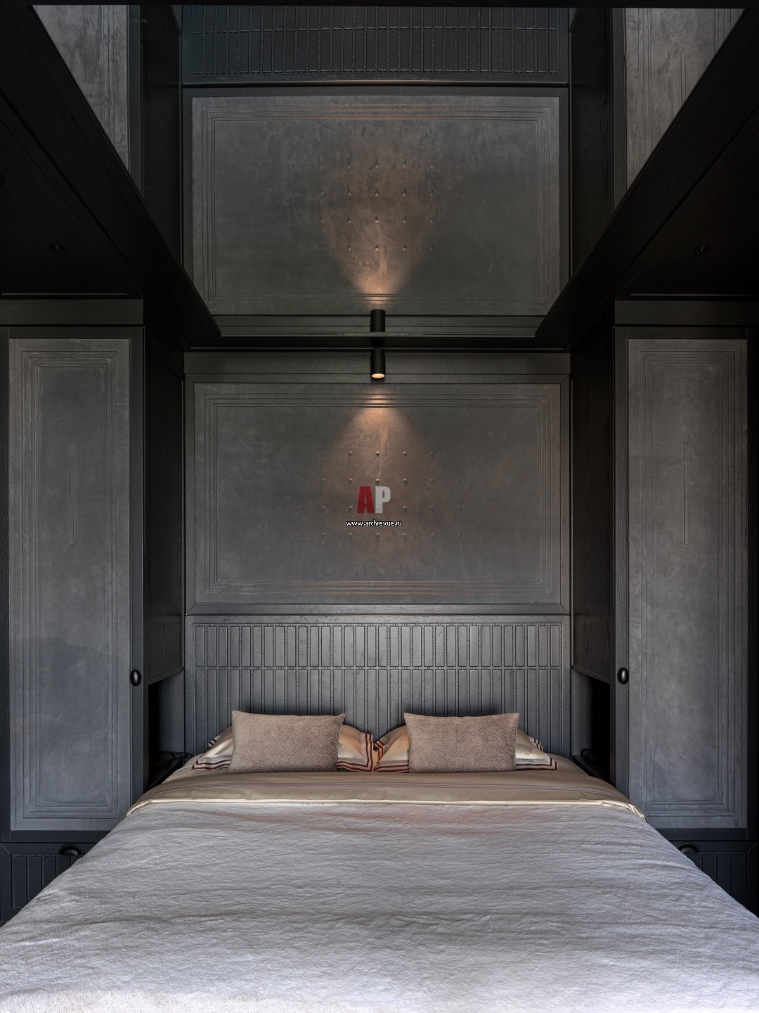 Спальня. Стены отделаны замшей с пальчиковым эффектом. Панели, шкафы и кровать выполнены по эскизам дизайнера. Зеркальный потолок увеличивает пространство