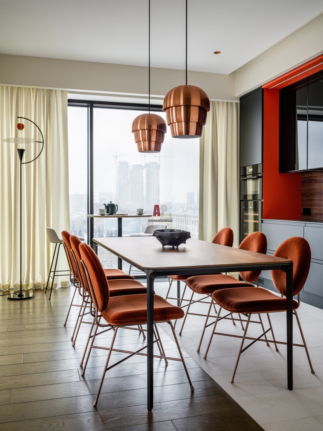 Яркая квартира для молодого бизнесмена. Кухня-столовая. Стол, Sovet Italia. Стулья, Bontempi. Медные светильники, BoConcept.