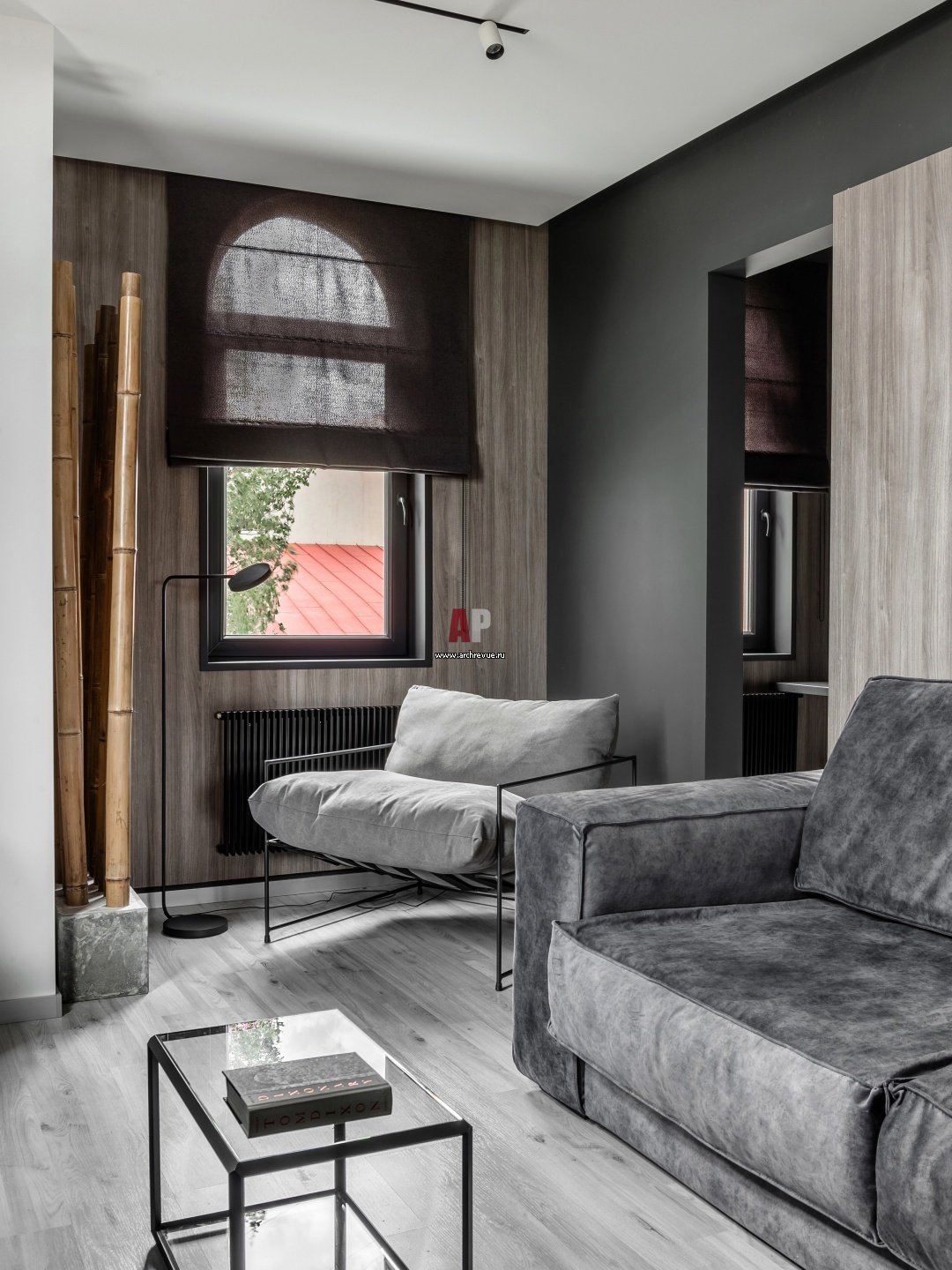 Гостиную украшает композиция из высоких стволов бамбука в углу. Заказчик много путешествует, а бамбук напомнил ему об Азии и поездках на Бали.