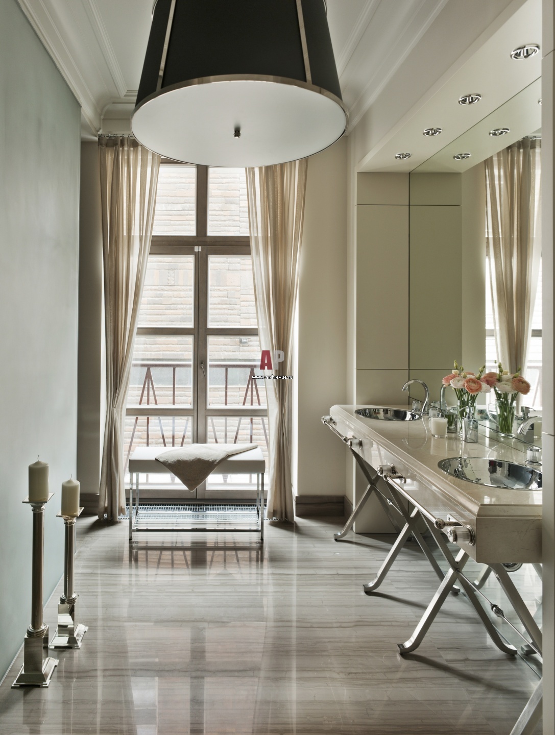 Интерьер ванной комнаты с французским окном. Подстолье умывальника из серебристого металла выполнено по эскизу Олега Клодта.