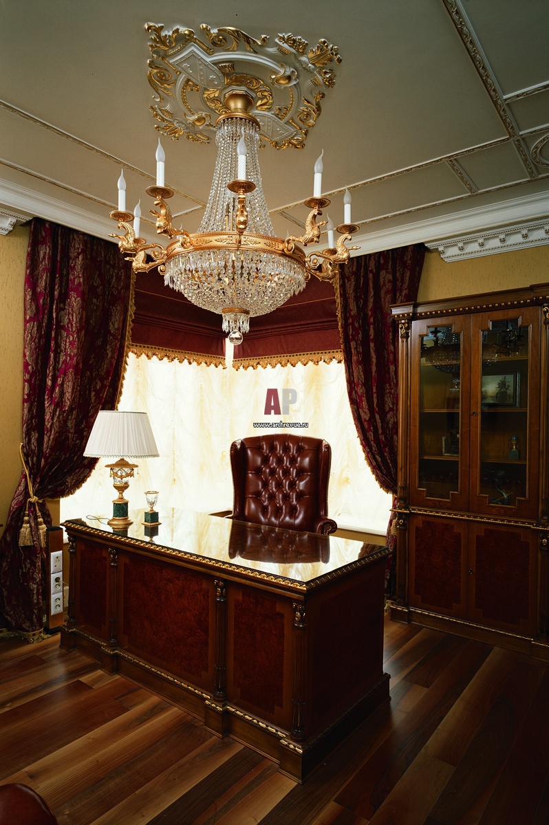Кабинет исполнен в строгом, представительском ключе: солидная мебель из ореха с золочеными деталями Fratelli Radice, тяжелые шелковые драпировки Declercq Passementiers, ампирная люстра Mariner настраивают на серьезный лад.