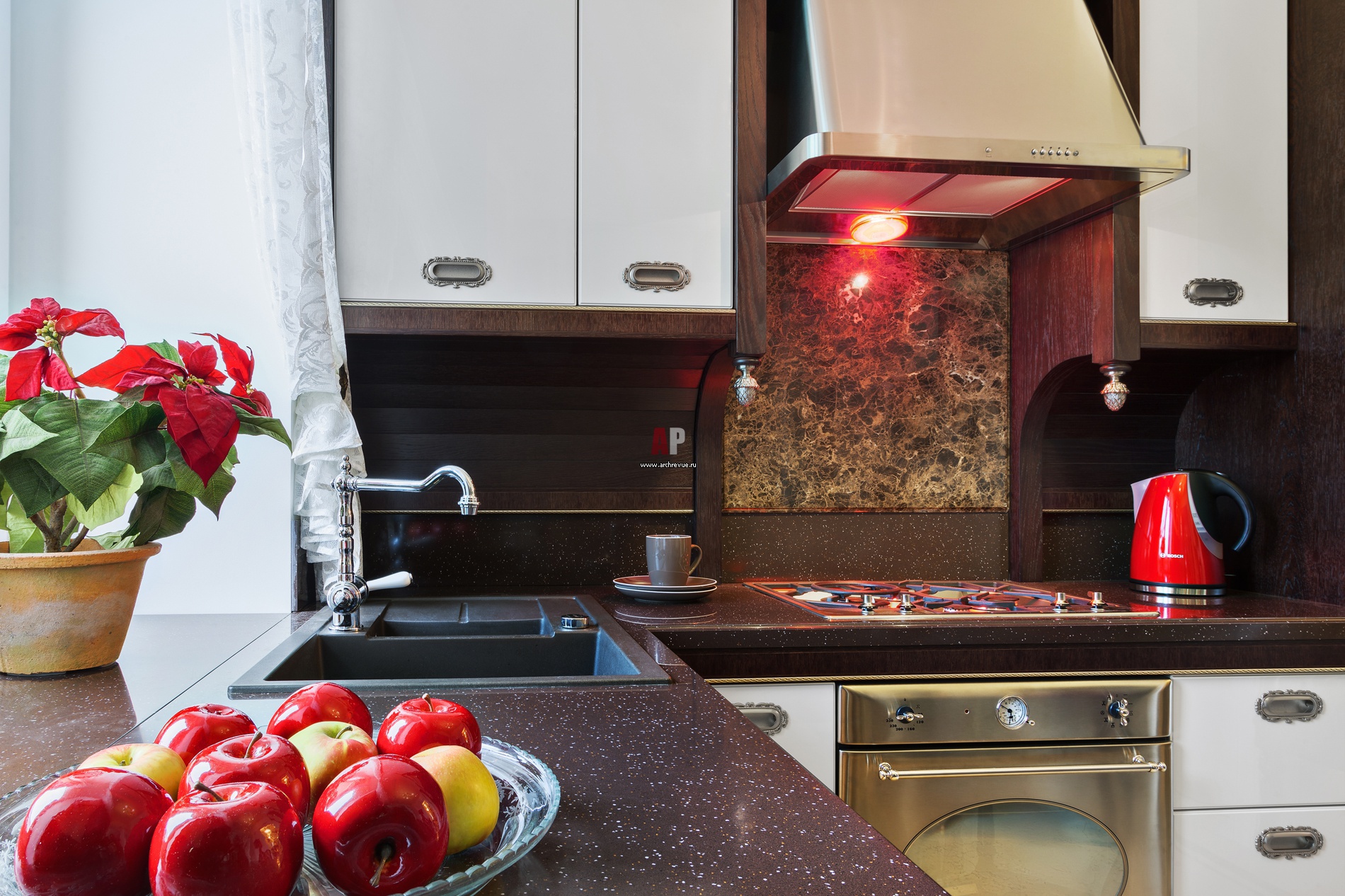 Дизайн-проект кухни в стиле кантри. Винтажная плита и вытяжка, Smeg. Кухонный фартук из темно-коричневого мрамора.