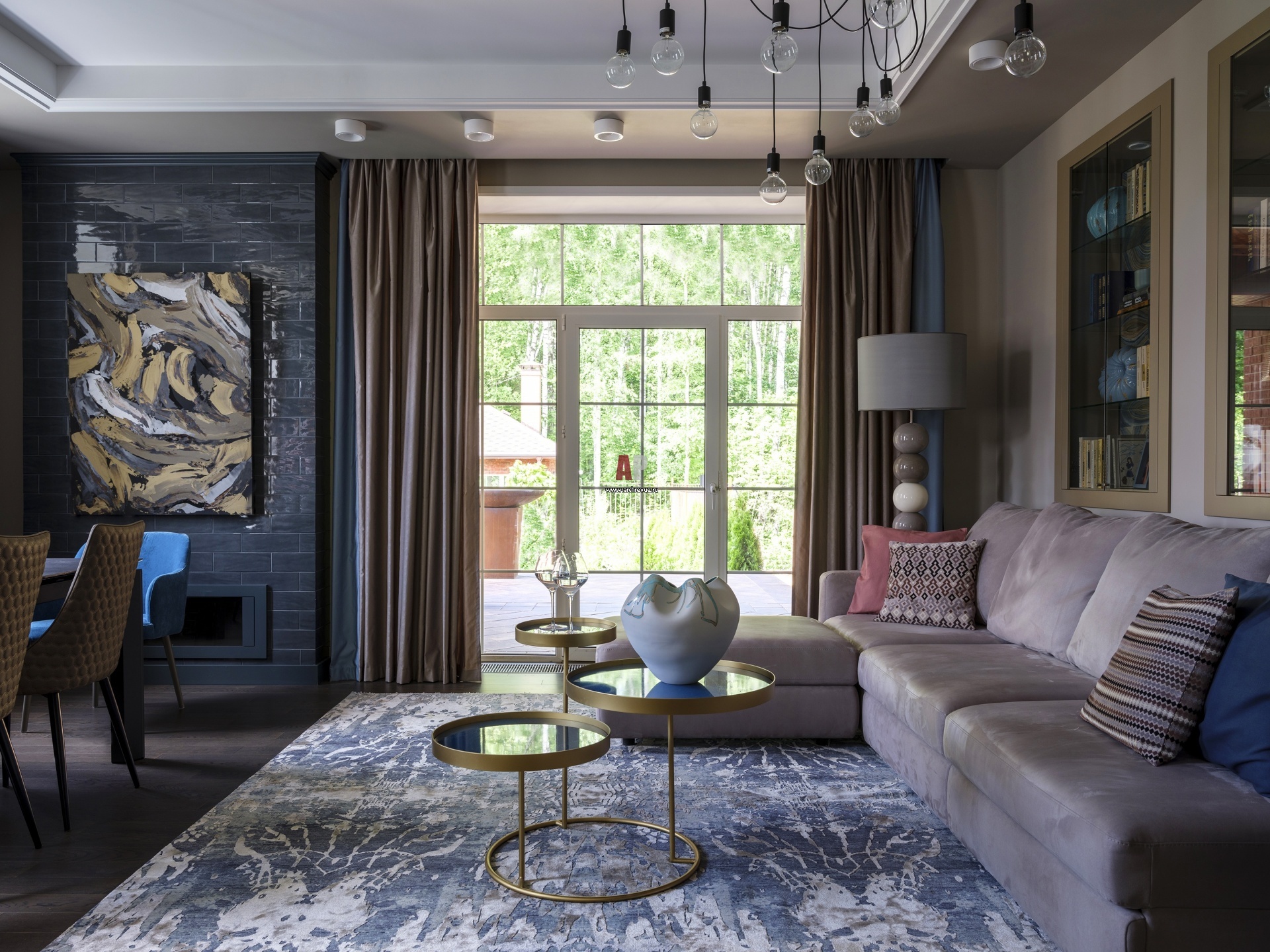 Из гостиной-столовой организован выход на уличную террасу. В ризалите, облицованном черной керамикой, размещена система домашнего кинотеатра. Пол, массивная доска, Coswick.
