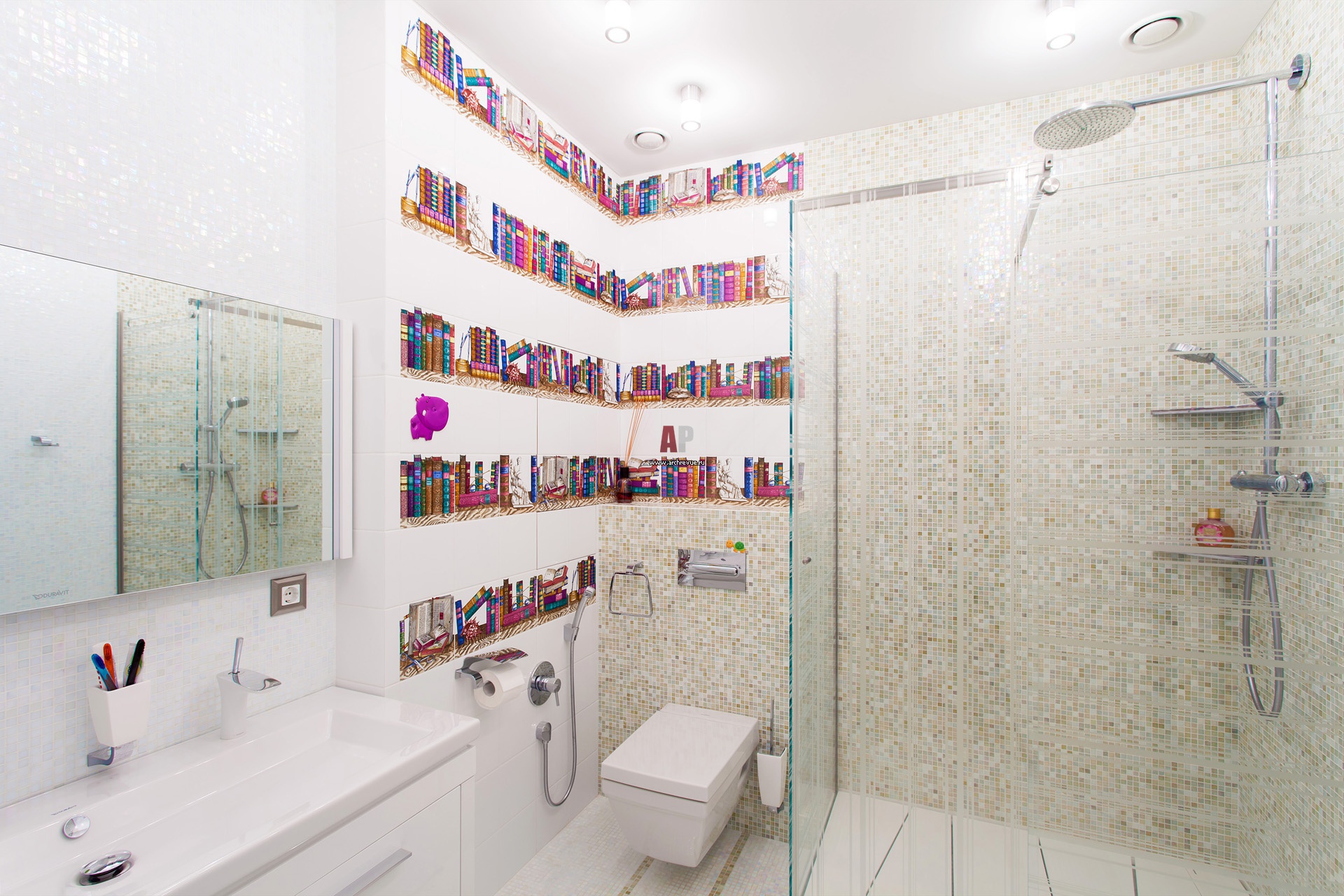 На фото – интерьер детской ванной комнаты с душевой кабиной. Керамическая плитка Ceramica Bardelli (коллекция Liberia), изображающая полки книгами, особенно эффектно смотрится на фоне бежево-перламутровой мозаики.
