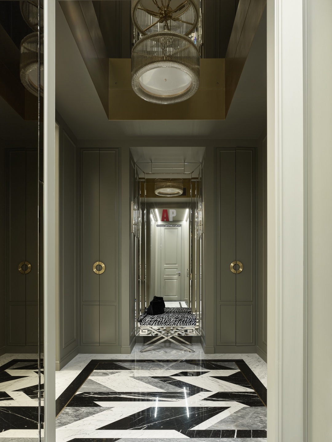 Прихожая. Шкафы с круглыми латунными ручками сделаны на заказ. Люстра, Favourite. Бра, Kolarz. Банкетка, Eichholtz. На полу – панно из натурального мрамора разных оттенков. Изделия из дерева - изготовление Bionica Wood.