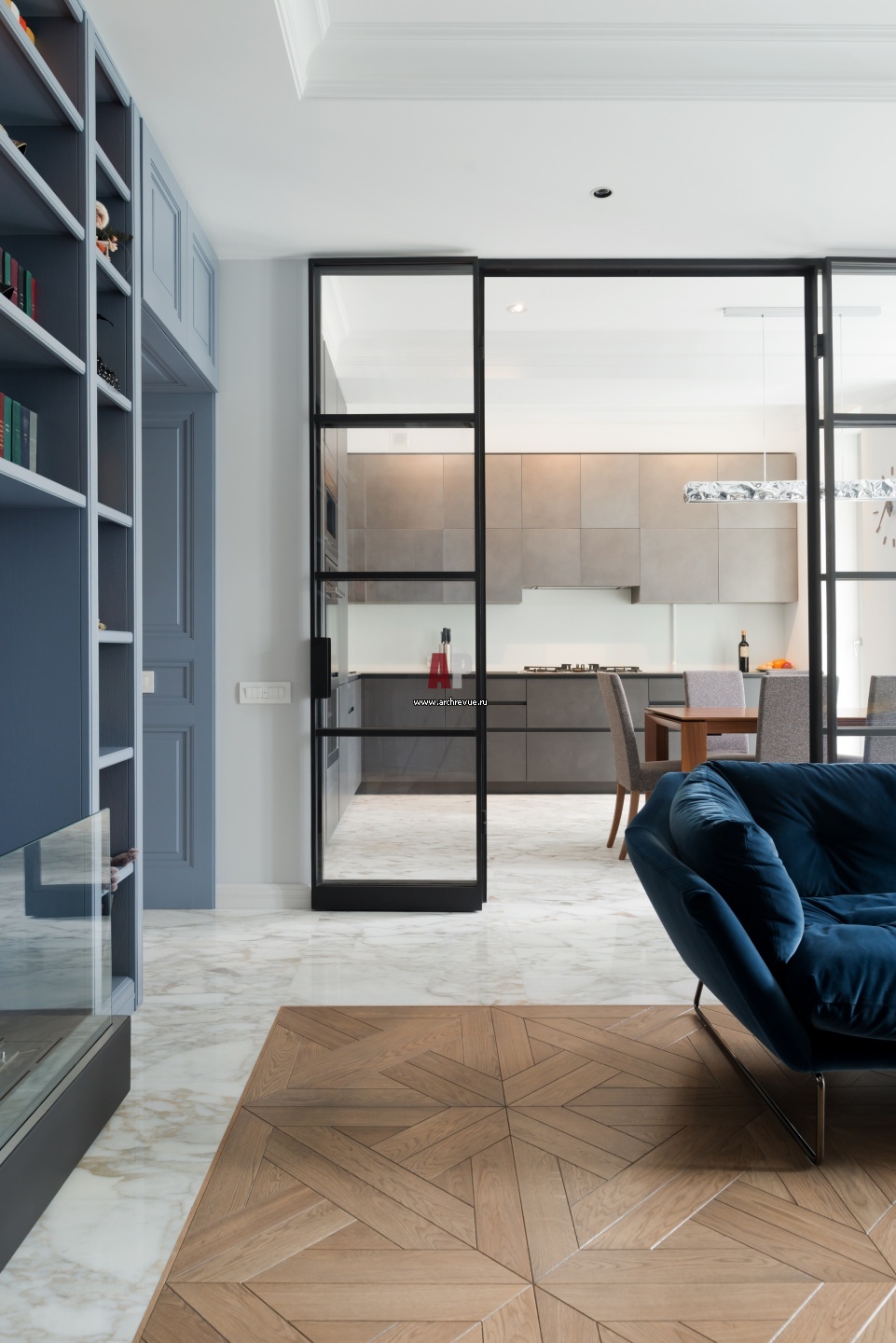 Расстановка мягкой мебели по центру помещения выделена отделкой пола: центр выложен модульным паркетом с классическим декором, периметр оформлен кантом из мрамора.