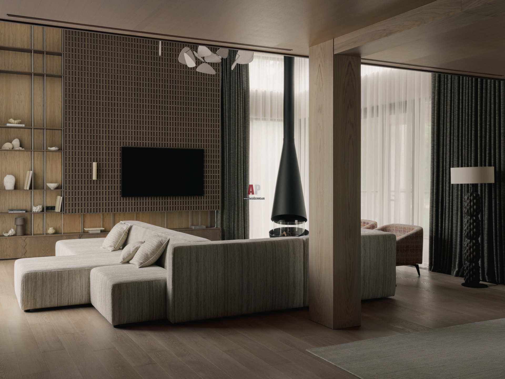 Мягкая группа с модульным диваном и ТВ. Геометрический орнамент стеновых панелей рифмуется со строгим рисунком падающих от стройных сосен теней.
