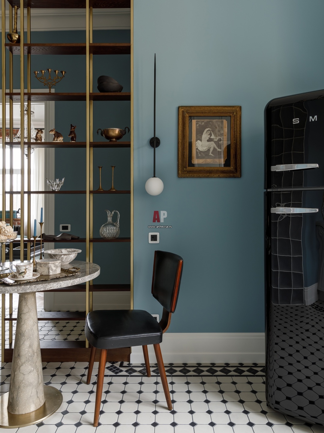 Классический интерьер с прохладным северным колоритом. От прохода в кабинет кухню изолирует стеллаж из металла.