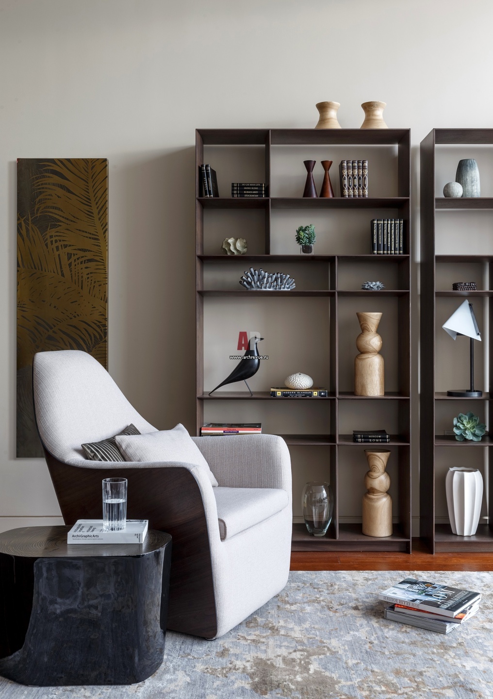Интерьер гостиной в стиле фьюжн. Кресло, TrendyMebel. Стеллаж, MHLiving.