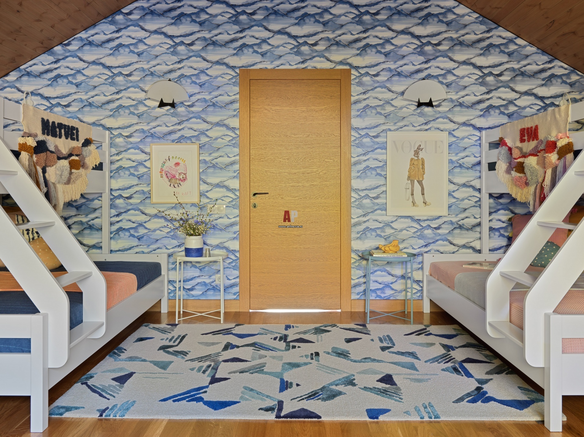 «В детской мы сделали две двухъярусные кровати: наверху спять дети, внизу – родственники, которые приезжают в гости. У окна во всю ширину комнаты установили рабочий стол для совместного досуга. Такая планировка напоминает о летнем лагере, где все спят и проводят время вместе», - рассказывает архитектор. На стене работа дочери архитектора Евы Басовой называется «Цирк» и постер обложки Vogue, художницы Наны Тотибадзе. Ковер, Persepol.