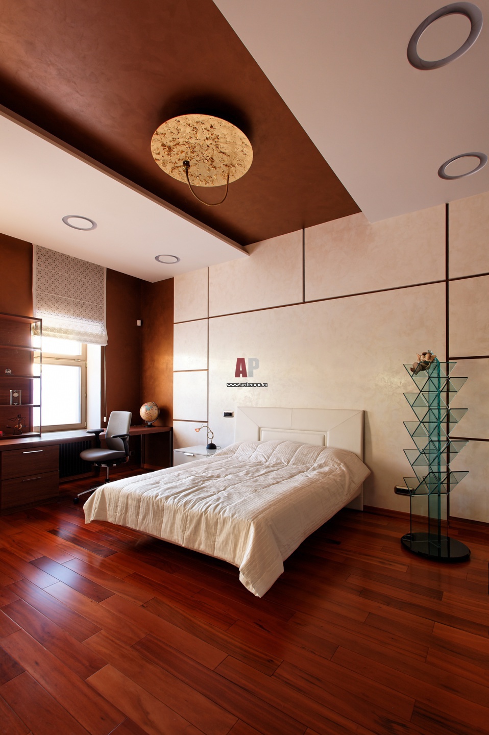 Комната дочери исполнена в современном стиле. На стенах – декоративные покраски, на полу – массивная доска из древесины тика. Возле окна организовано рабочее место.