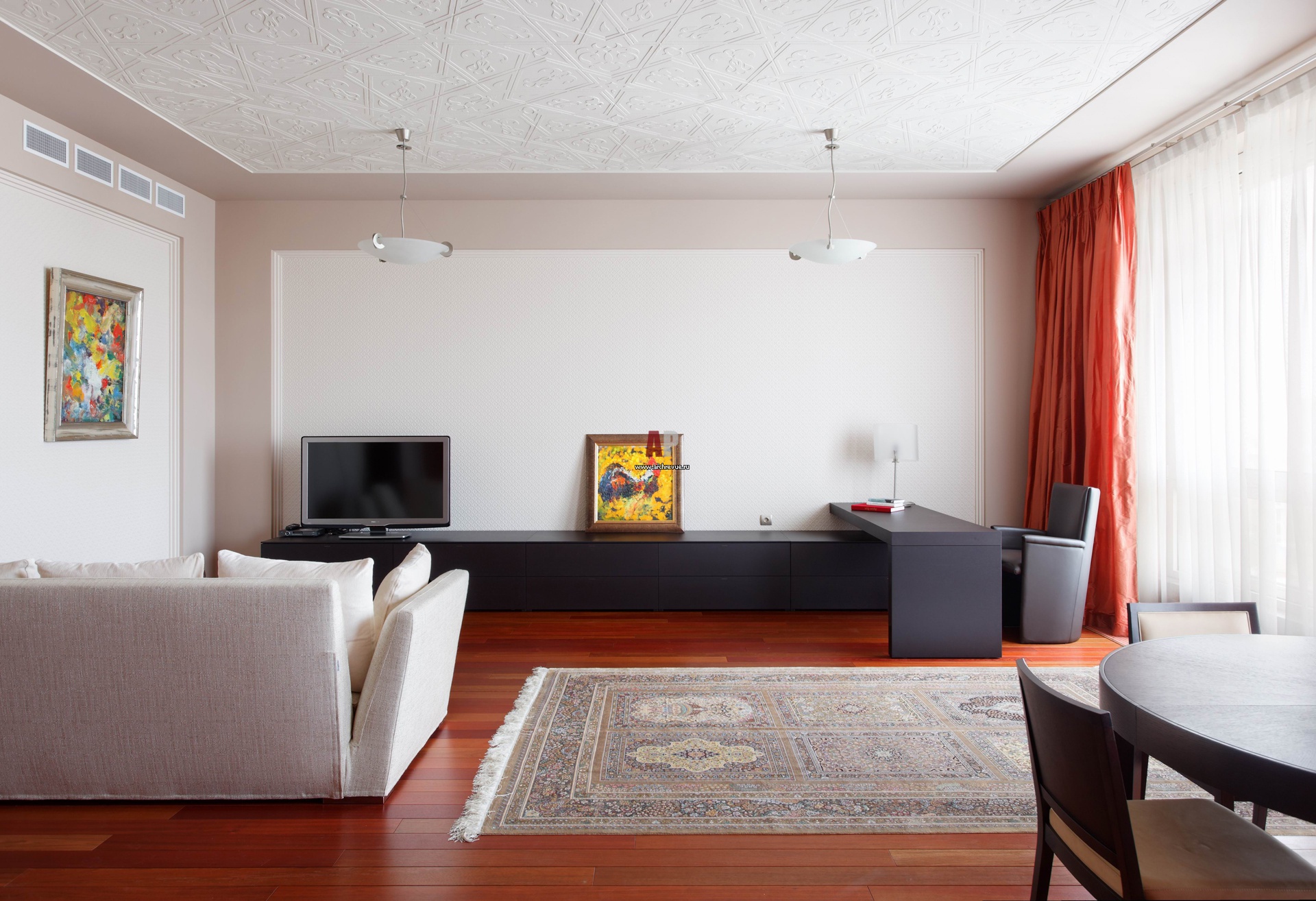 Зону кабинета формирует горизонтальная композиция Molteni&C в духе супрематизма из рабочего стола и системы хранения.