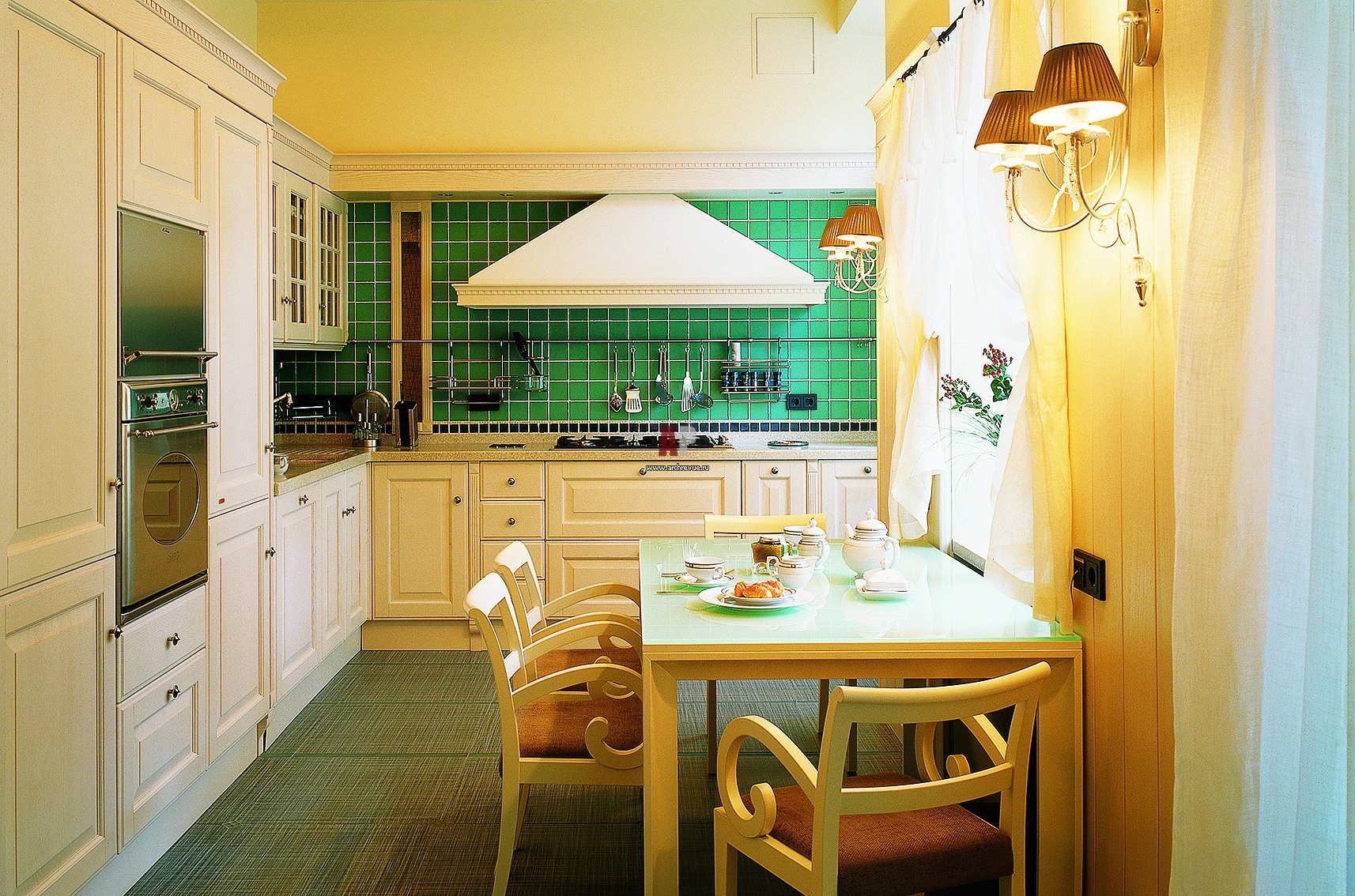 В интерьере кухни заметны черты стиля Прованс. Кухонная мебель Scavolini с деликатным классическим декором выкрашена в белый цвет. Плита оснащена массивными чугунными конфорками. Фактура плитки на «кухонном фартуке» напоминает бутылочное стекло.