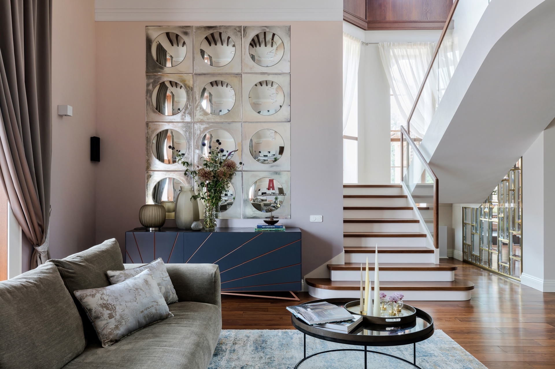 Украшение гостиной – настенное панно из 12 выпуклых зеркал и перегородка из стеклянных кристаллов в латунном обрамлении. На стенах – обои с эффектом градиента, они выполнены на заказ.
