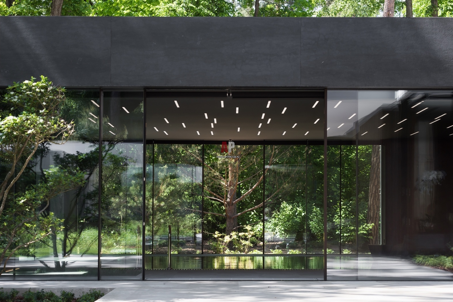 Благодаря двум парам раздвижных дверей объем бассейна работает на просвет. Панорамное остекление Sky-Frame.