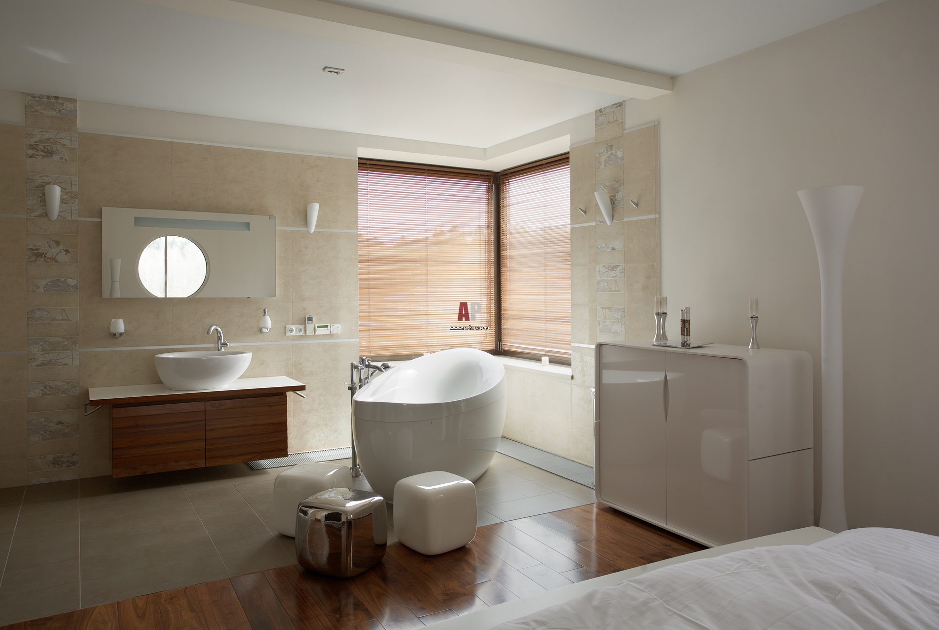 Фото интерьера хозяйской ванной. Ванная с умывальником интегрированы в пространство главной спальни.