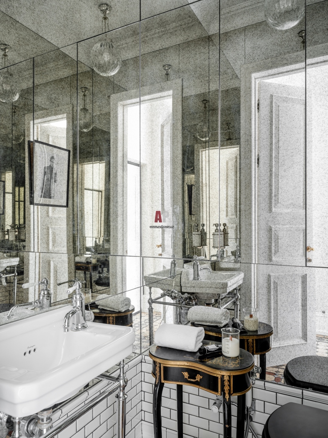 Мокрая зона гостевого санузела была размером всего 1.2х1.4 метра. Визуально увеличить пространство санузла почти в два раза позволило оформление стен зеркальными полотнами с состаренным эффектом. Сантехника, Burlington.
