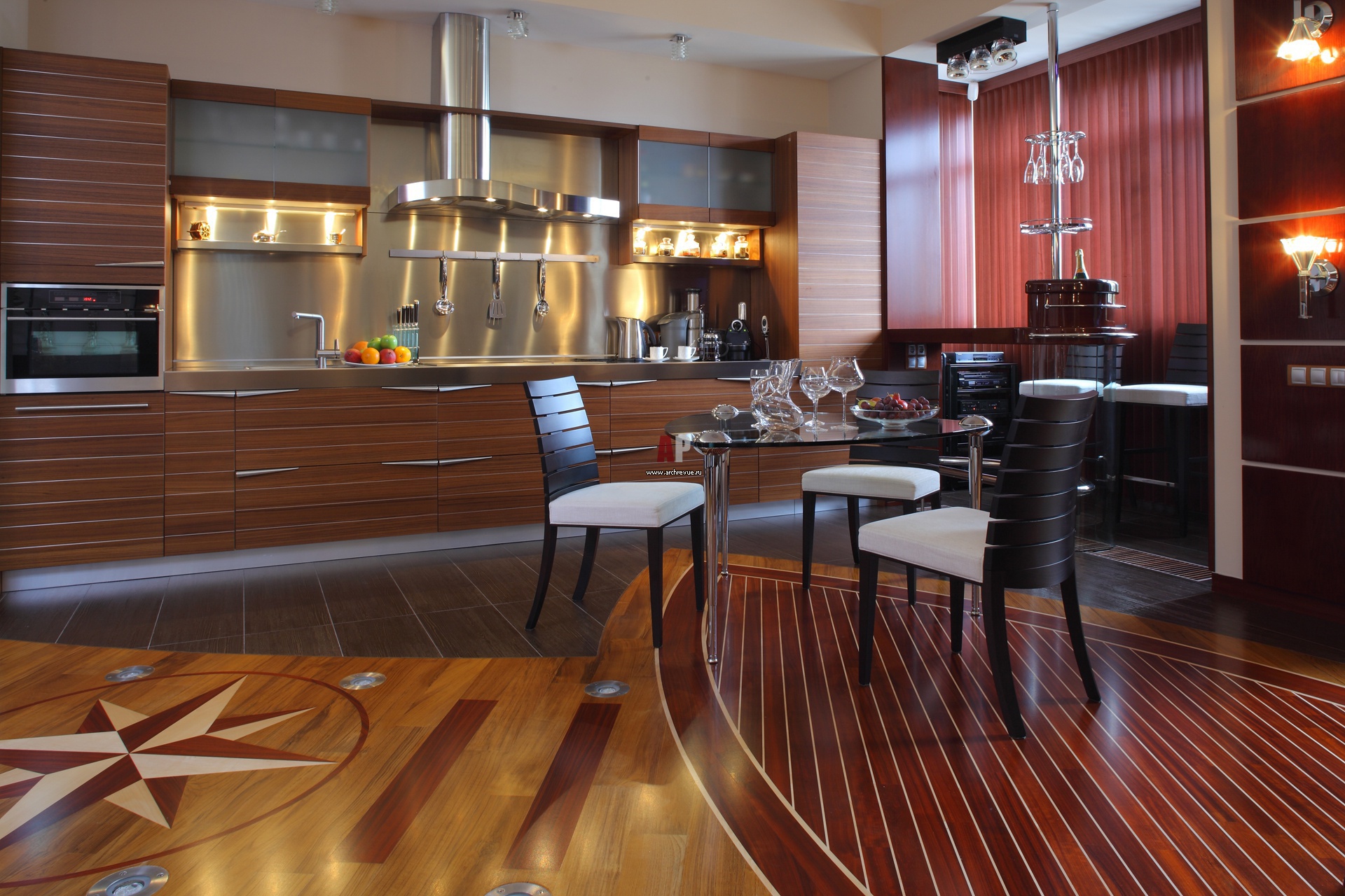 Кухня расположена в «кормовой» части помещения. Кухонный фартук и вытяжка – из хромированного металла. Кухонный гарнитур из шпона дерева, Snaidero.