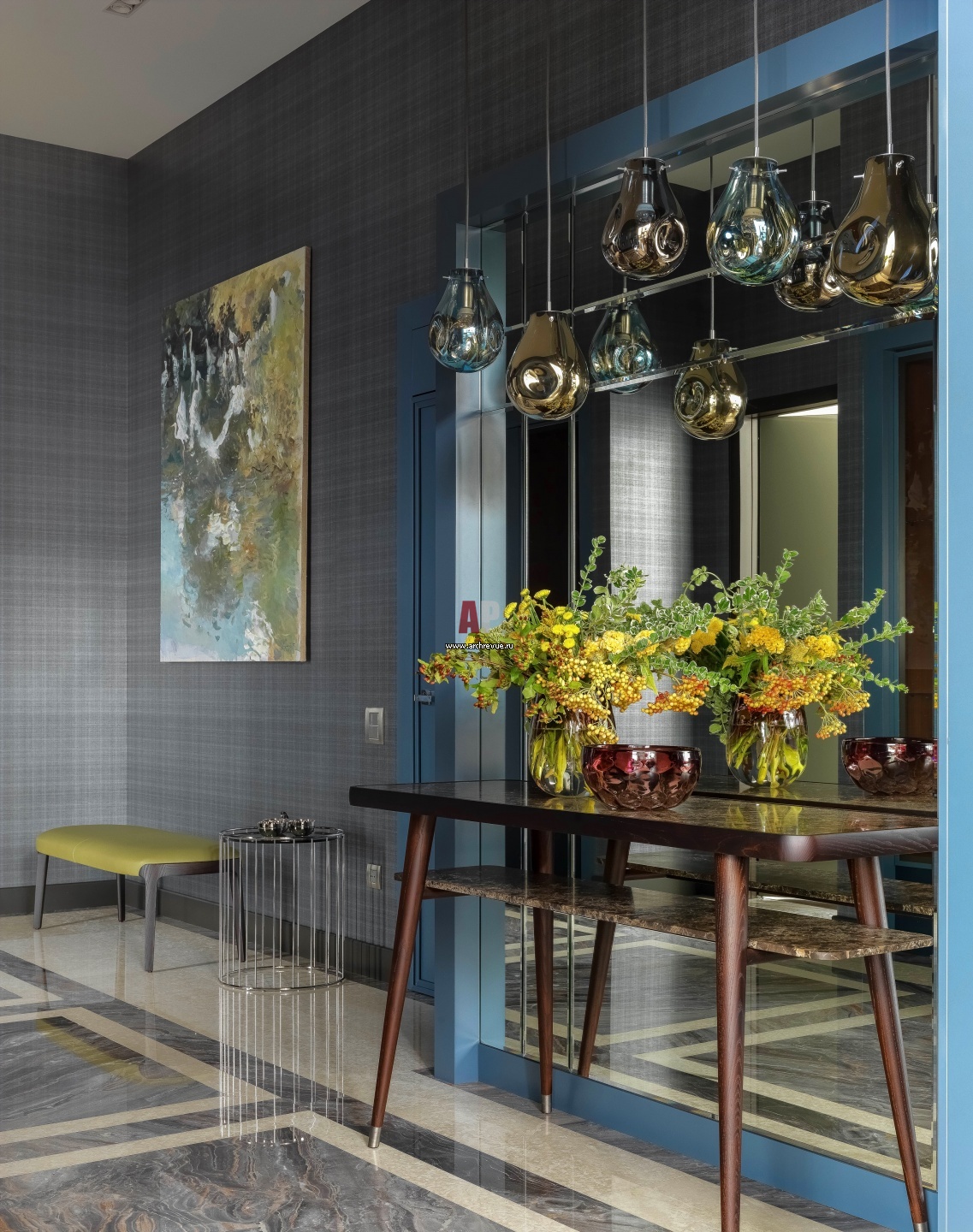 Семейный пентхаус в Краснодаре. Интерьер прихожей. Консоль, Porada, модель Chantal. Банкетка, Potocco, модель Velis. Столик, Minotti. Подвесные светильники, Bomma. Обои, Covers Wall Coverings, коллекция Textures Granule 02-Carbon.