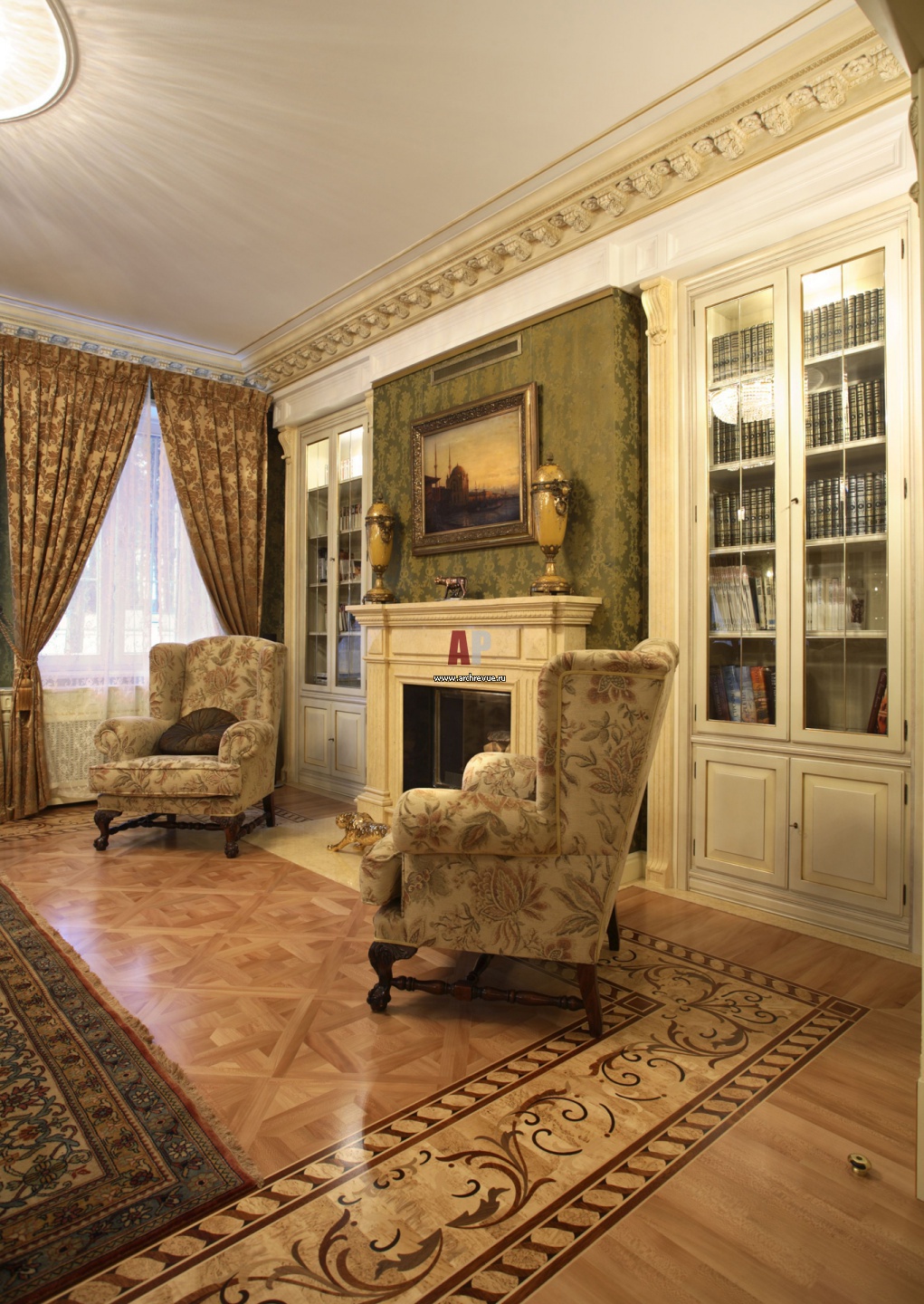 Пол в гостиной выстлан паркетом по авторским эскизам: восточный орнамент выложен из карельской березы, дуба и платана. Изготовление, «Ковчег-паркет».