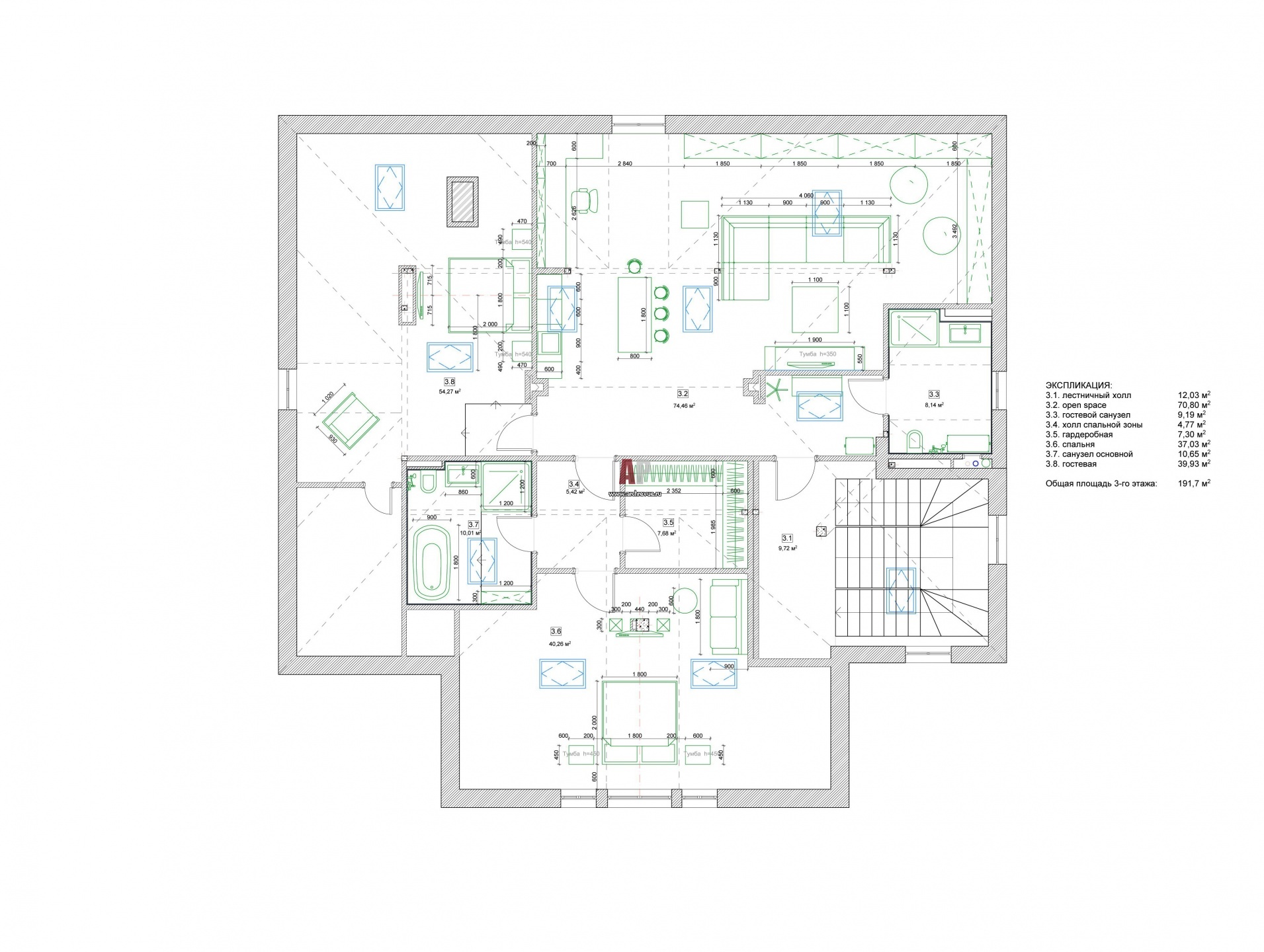 Планировка 3 этажа 3-х этажного дома. Общая площадь – 720 кв. м.