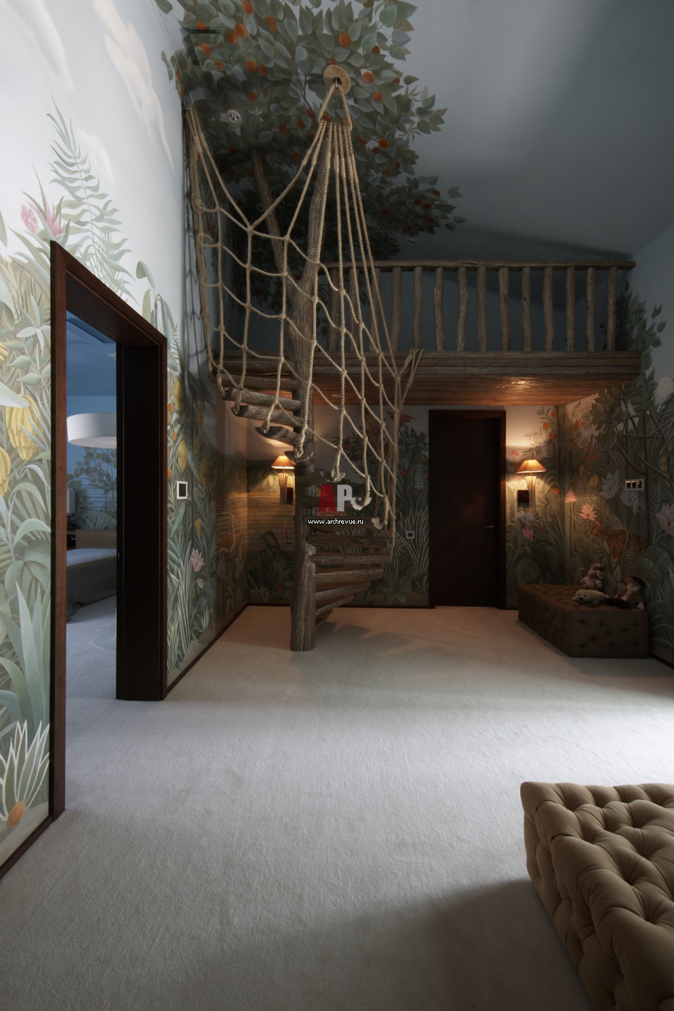 Детская игровая. В оформлении использован мотив джунглей. Антресоль поддержана винтовой лестницей, опутанной канатами, и напоминает домик на дереве.