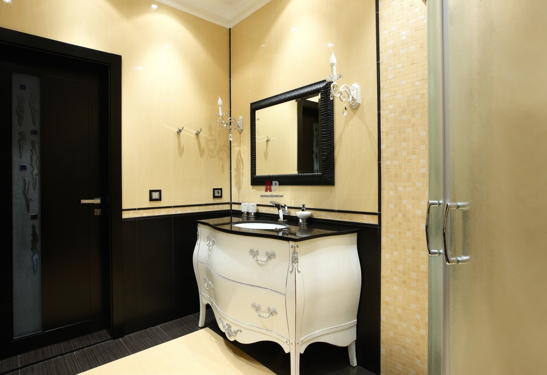 Фото интерьера гостевого санузла Стеклянная душевая кабина изготовлена на заказ, металлические элементы выкрашены в цвет необарочной мебели, компания «Студия Модерн».