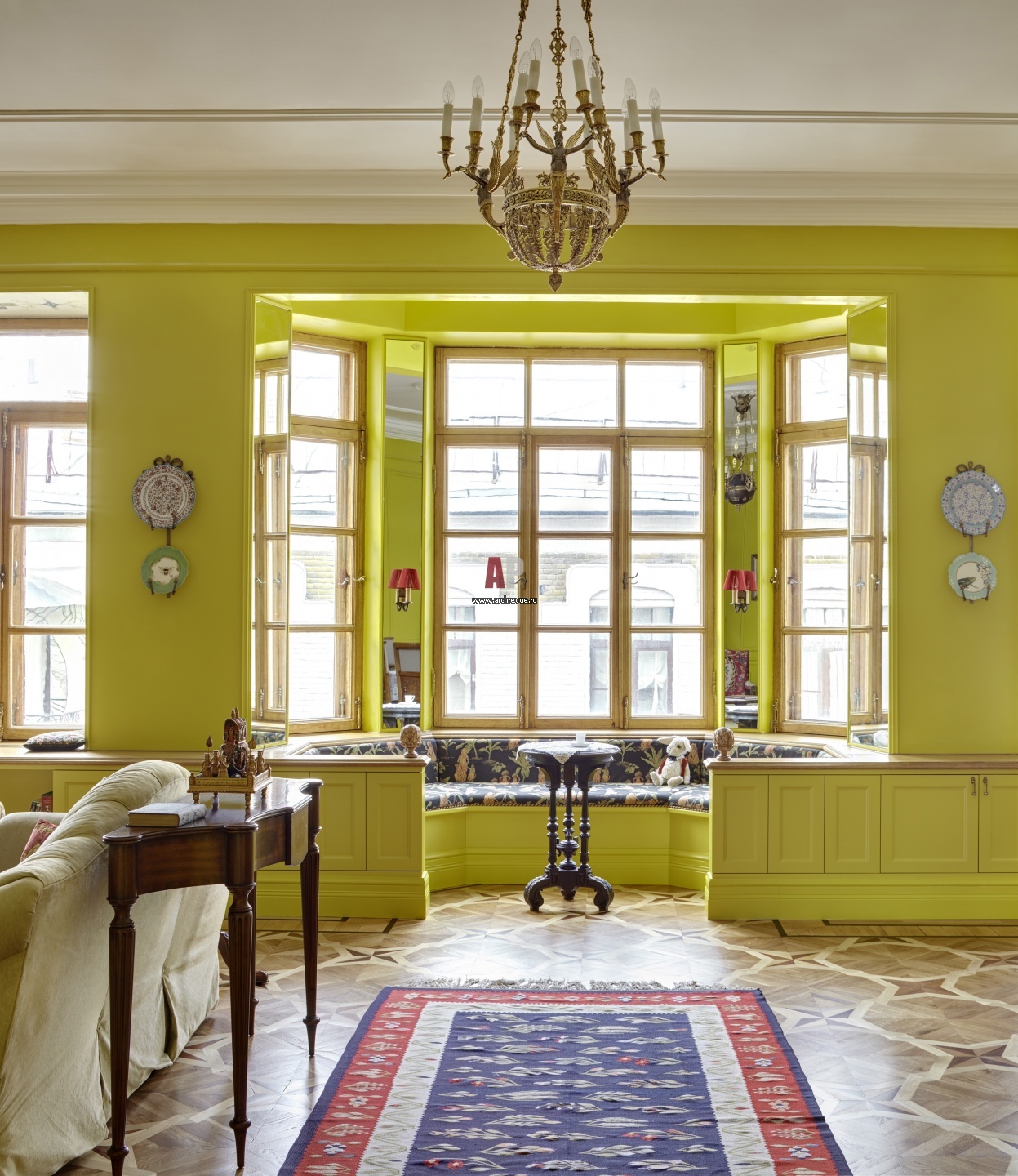 У окна гостиной напротив входа сделана мягкая зона. Под окнами расположены встроенные шкафчики. В откосы окна вставлены вертикальные зеркала, они усложняют пространство. Диван, шкафы, на заказ, по эскизам.