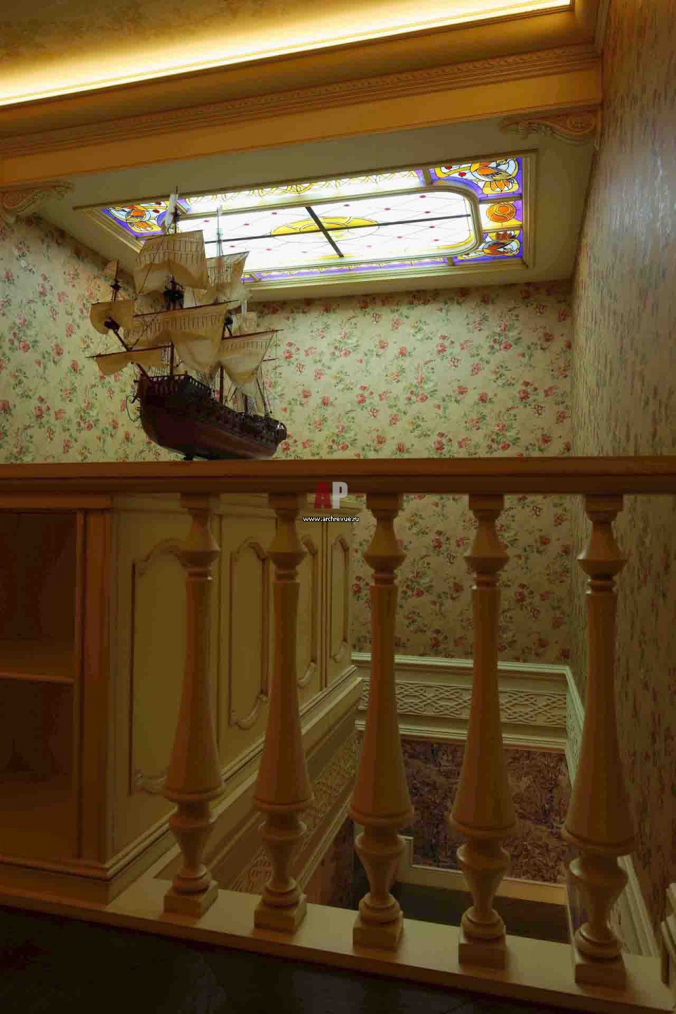 Лестничный холл второго этажа. Чтобы визуально увеличить небольшой объем и наполнить его светом, на потолке смонтирован витраж с готическим орнаментом.