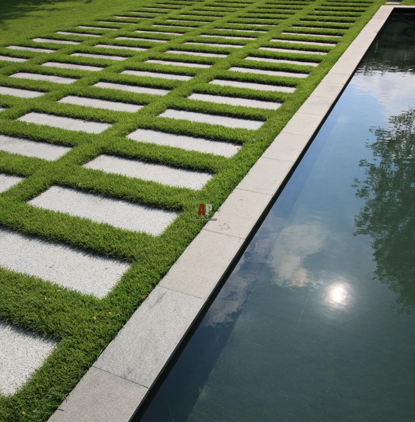 Фото ландшафта. Прямоугольная форма водоема перекликается с деталями мощения из гранита.