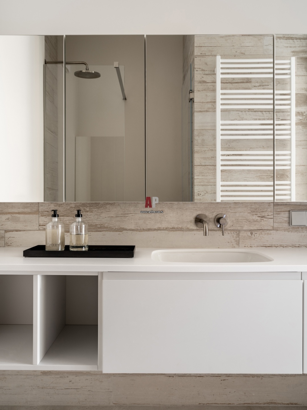Хозяйский санузел оформлен в той же нейтральной цветовой гамме, что и остальные помещения квартиры. Керамогранит, Sant Agostino. Умывальник, на заказ.