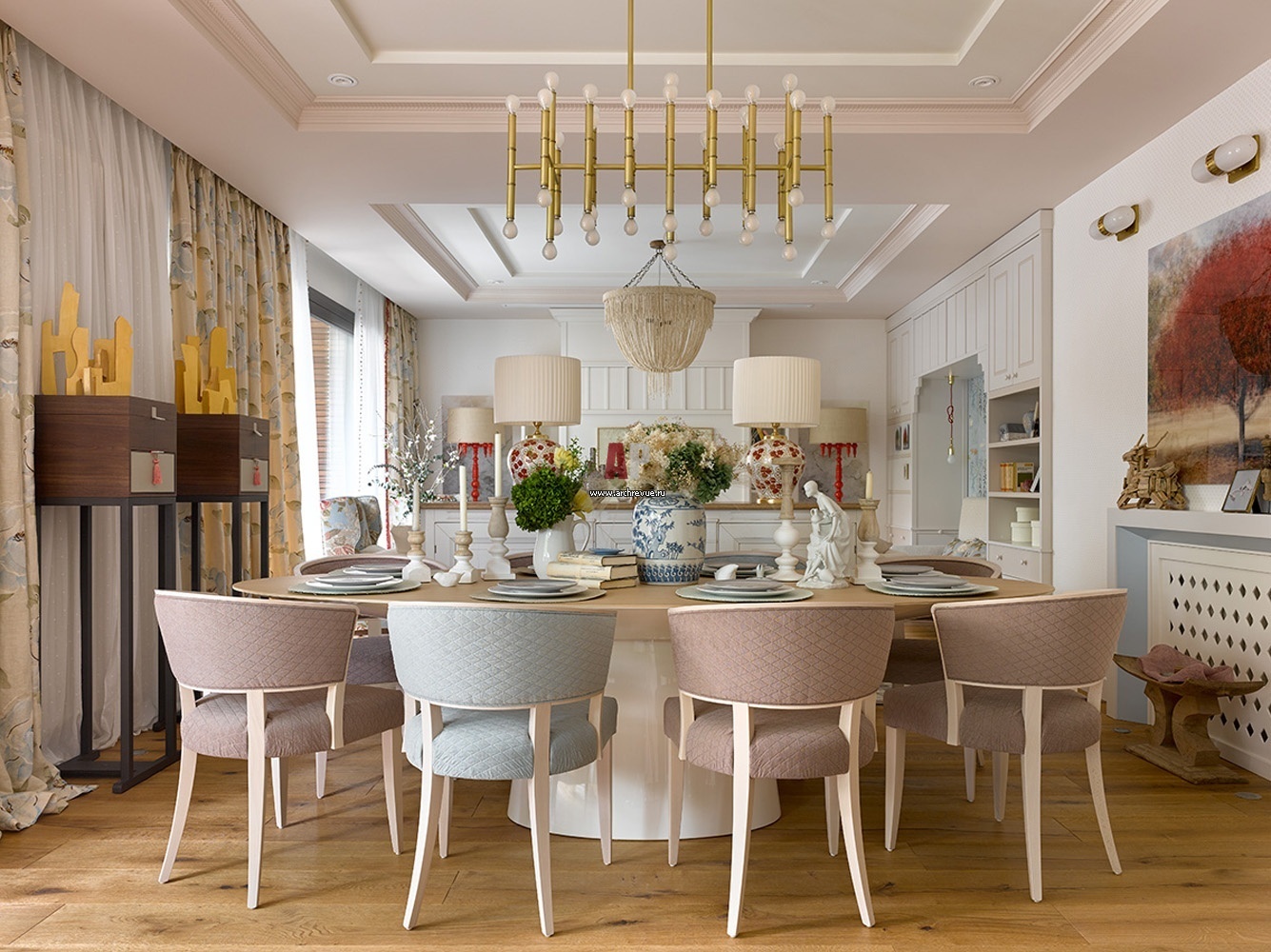 Зону гостиной от столовой отделяет классический комод, Flai. Круглый обеденный стол на 8 персон, Emmemobili, модель Ufo. Стулья, Billiani. Потолочный светильник, Jonathan Adler.