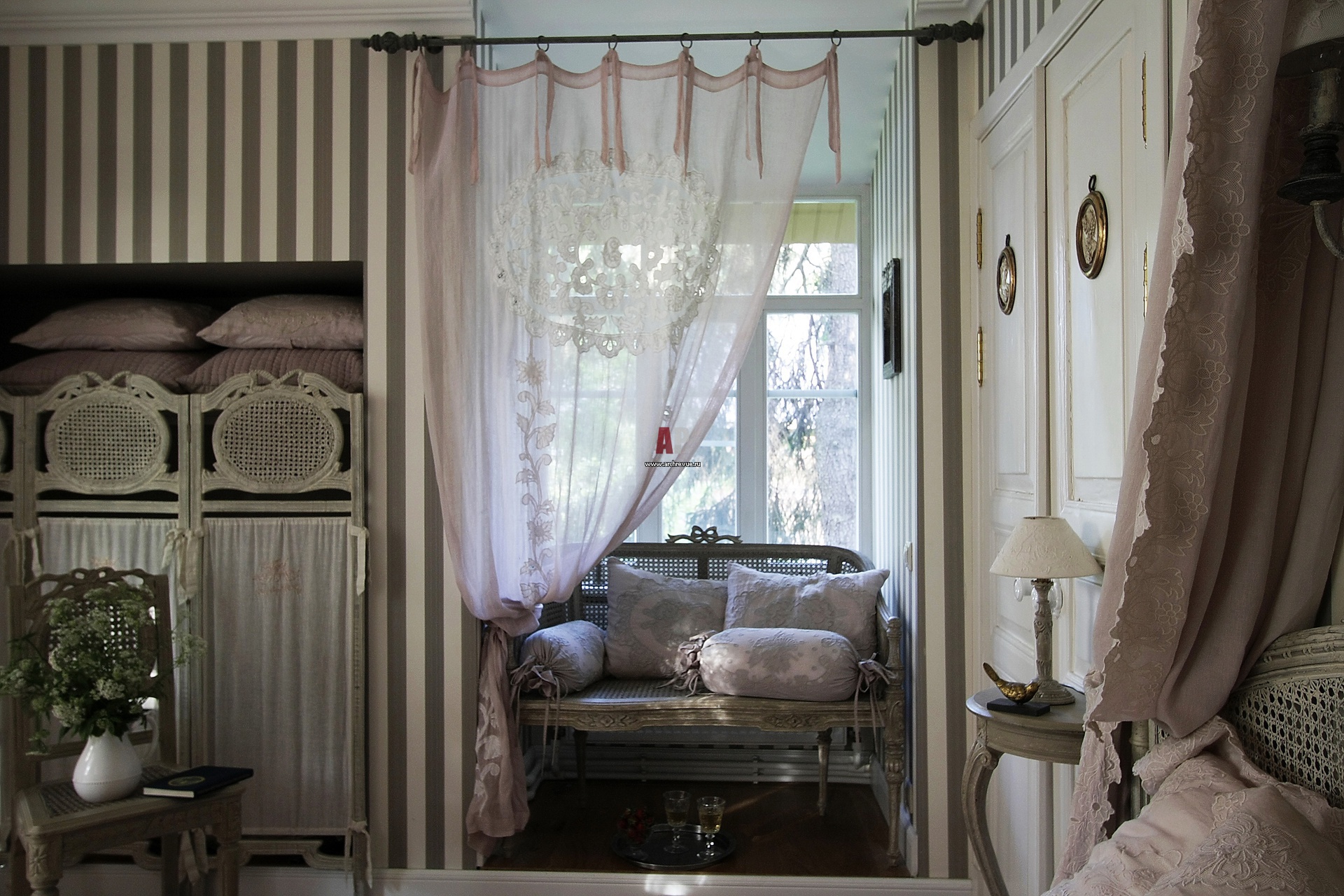 В спальне возле окна на небольшом возвышении сделана зона отдыха с маленьким диваном. Слева – встроенный шкаф для хранения постельных принадлежностей. Вместо распашных дверей – декоративная ширма в стиле Прованс.