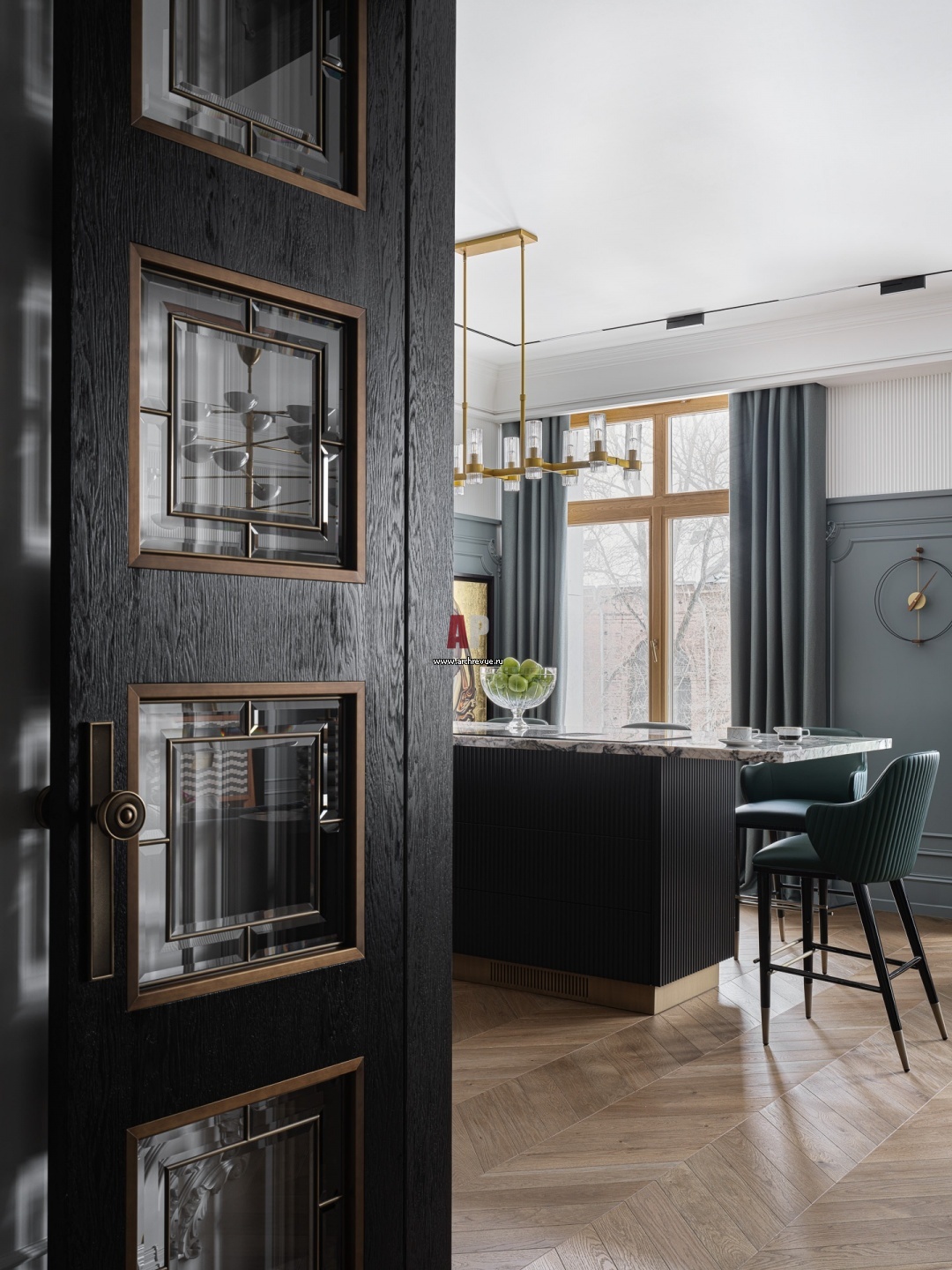 Гостиную от коридора отделяют распашные двери со стеклянными витражами в стилистике ар-деко.