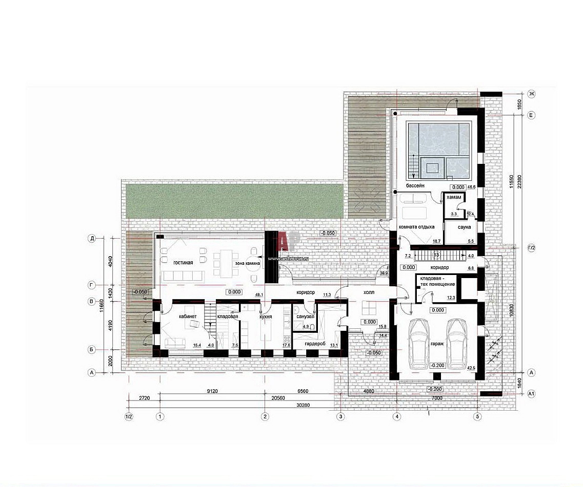 Внутренний план двухэтажного дома. Общая площадь – 650 кв. м.