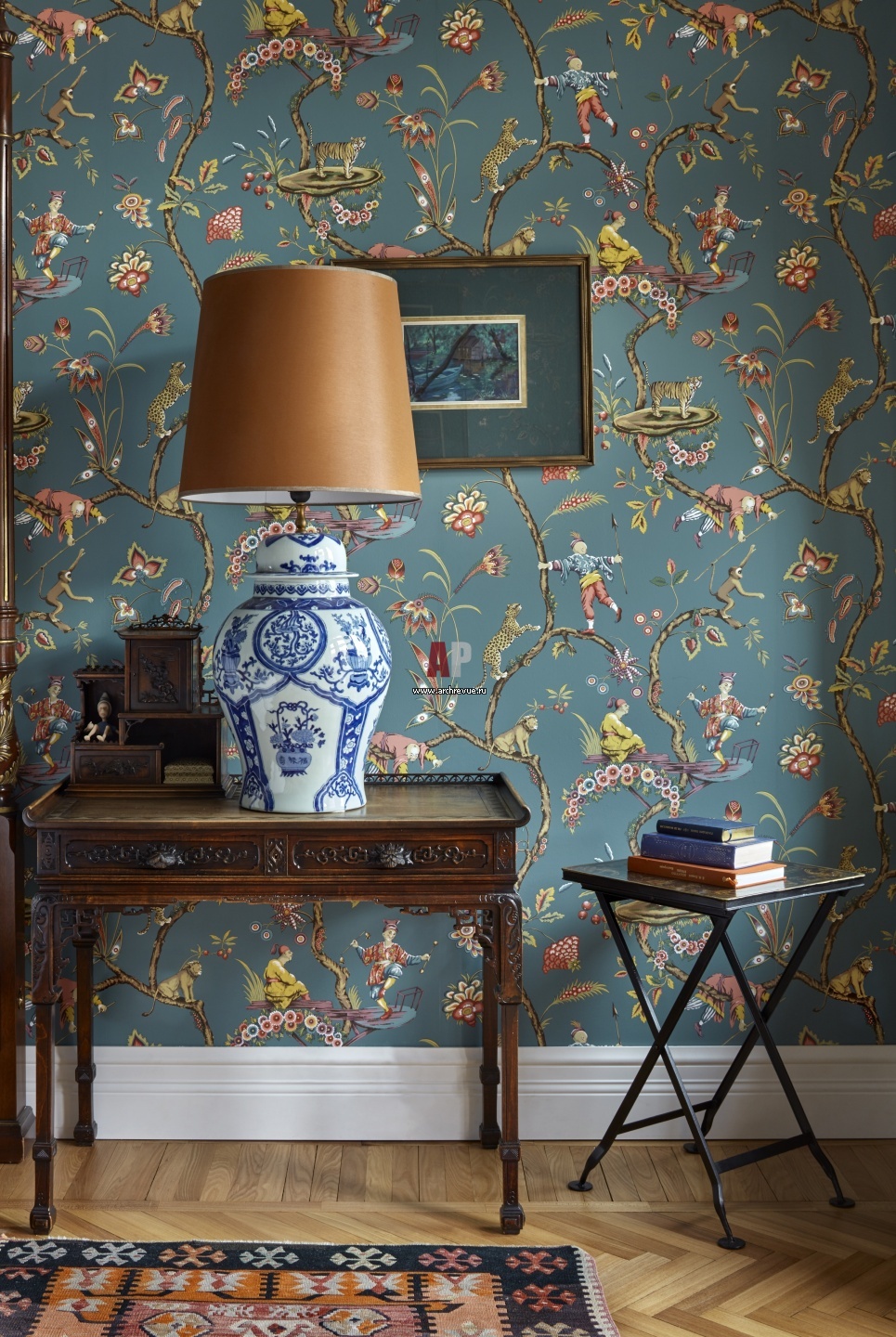 Фрагмент спальни. Обои, Scalamandre, коллекция Chinoise Exotique. Прикроватный столик в стиле шинуазри, антиквариат.
