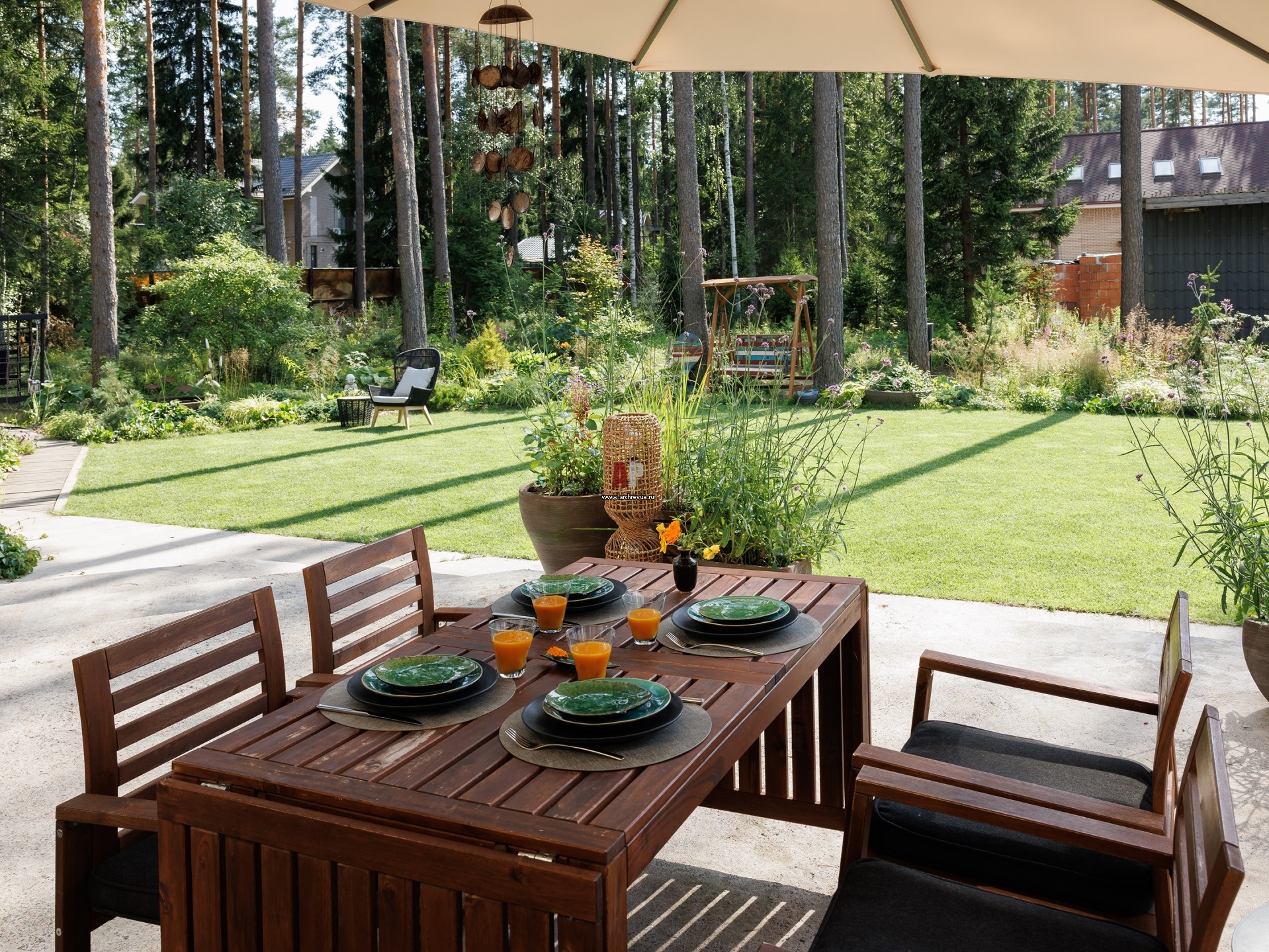 Выход на террасу организован из кухни. За ней находится большая детская площадка, которая хорошо просматривается из гостиной.