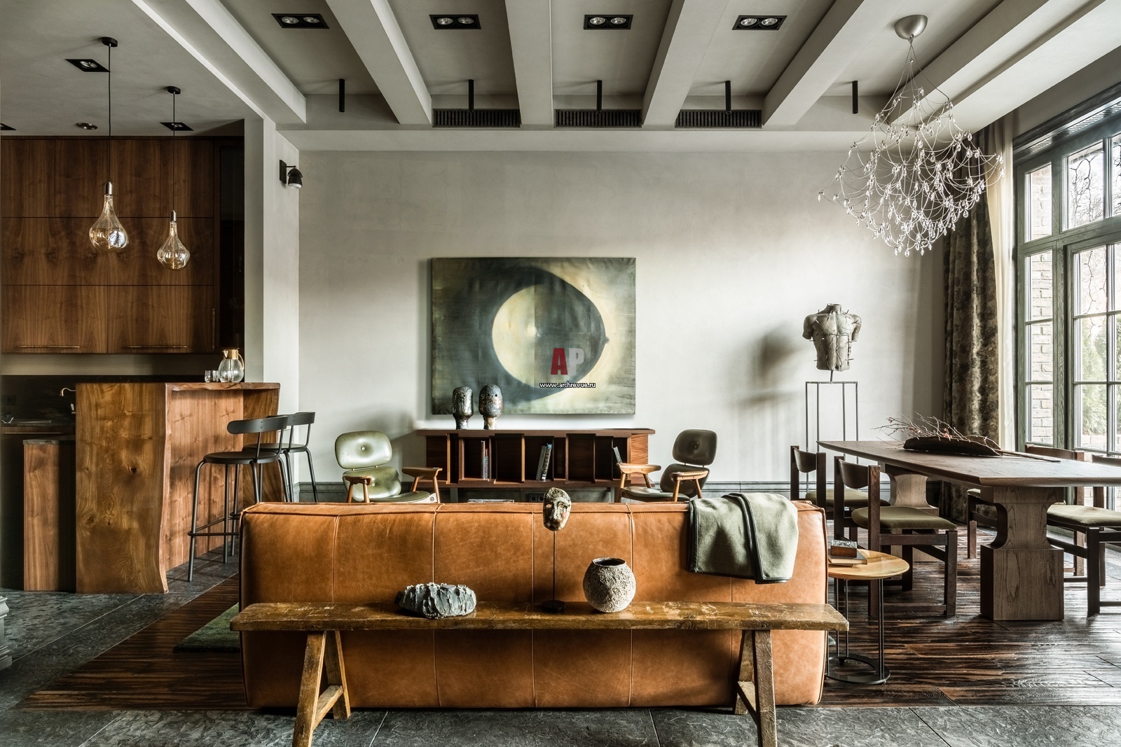 На первом этаже организовано общее пространство гостиной, столовой, кухни и мягкой зоны у камина. Диван, Ethnicraft. Книжные полки, Ceccotti. Журнальный стол, Cassina. 6 потолочных балок – декоративные, в них встроены решетки вентиляции и кондиционирования. Технический свет, Delta Light.