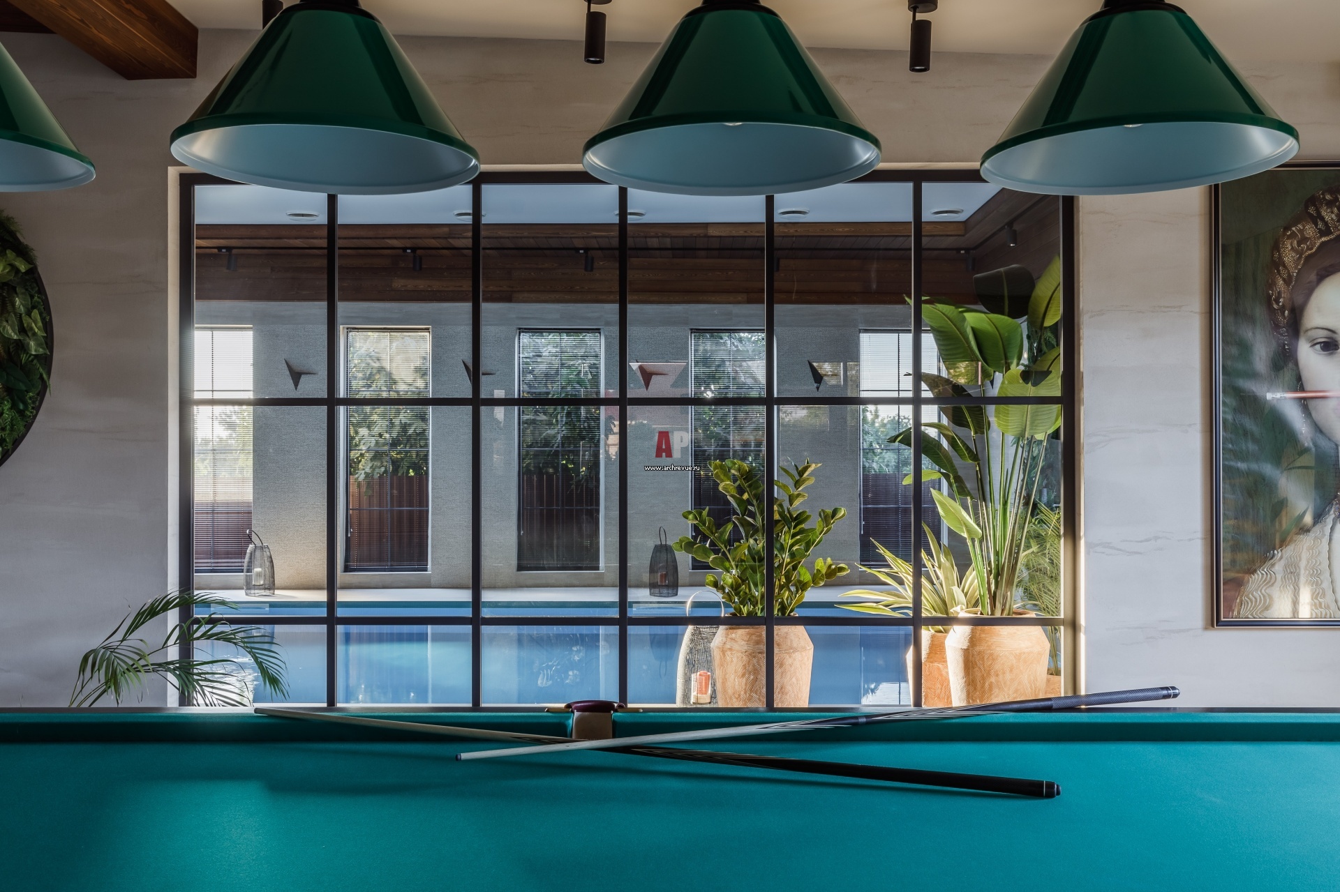 Бильярдная. За раздвижными стеклянными дверями находится бассейн с хаммамом.