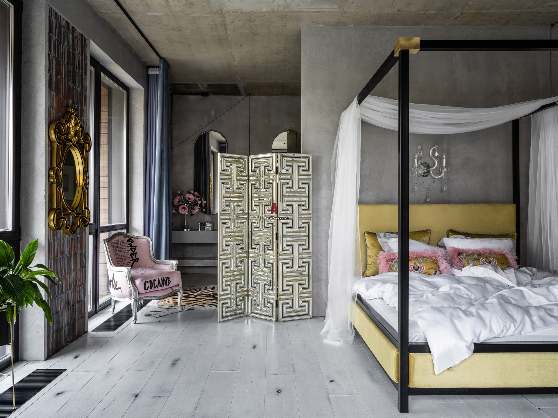 Ванная комната интегрирована со спальней. Туалетный столик отлит из бетона. Стулья, Kartell и Jimmie Martin.