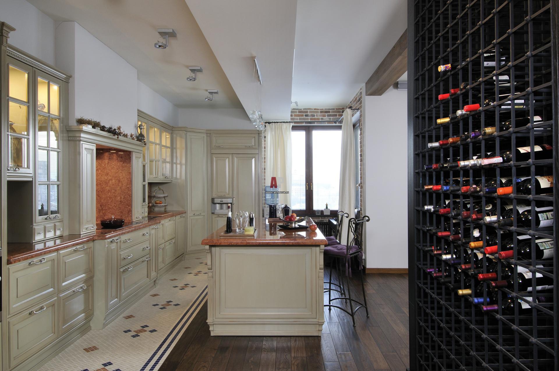 На кухню Brummel Cucine, поставщик «Частный интерьер», можно попасть прямо от входной зоны, туда провожает винный шкаф, выполненный в «Мастерская Вениамина Скальника» по эскизу автора. Этот шкаф стал оригинальным исполнением несущей конструкции, которую обшили дубом и встроили внутрь кованые отделения для бутылок вина. Винный шкаф, таким образом, гармонично перекликается с кованой лестницей