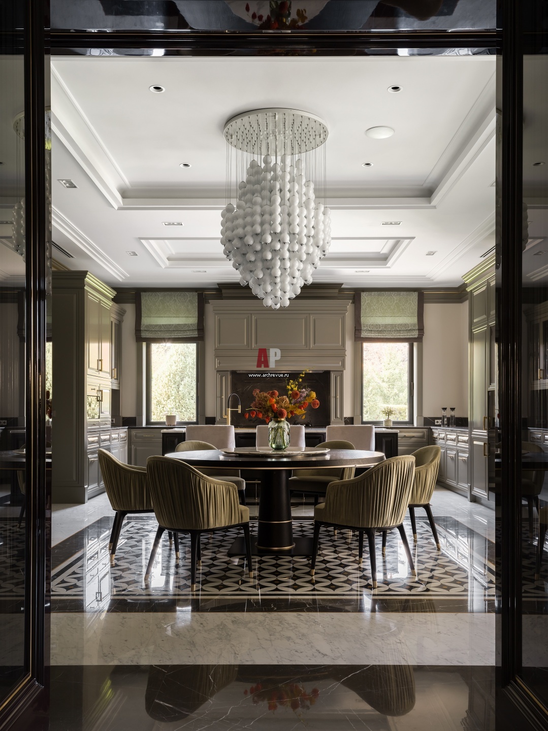 За витражными дверями находится кухня. На полу – мраморное панно с контрастным рисунком.