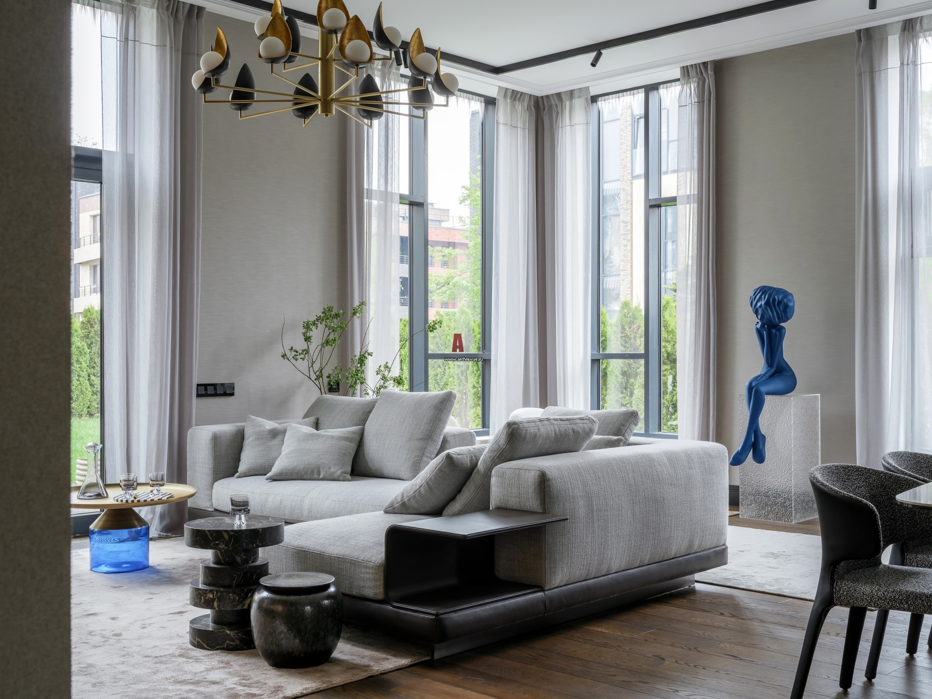 Интерьер гостиной. Угловой диван в серой натуральной обивке.