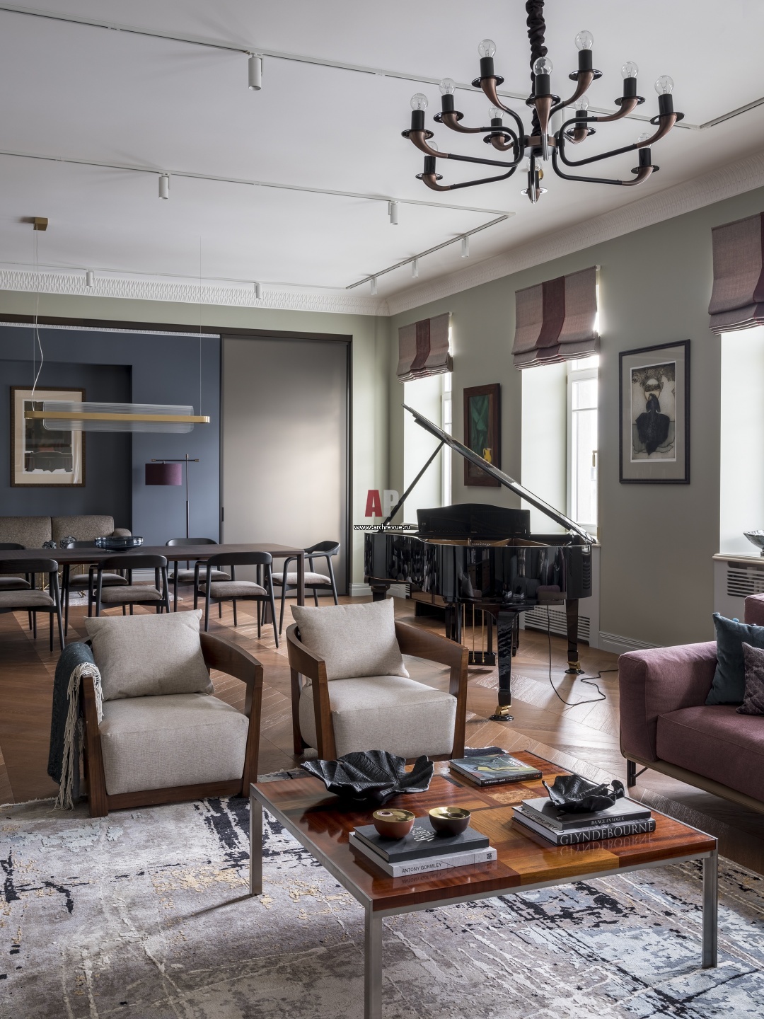 Общая гостиная с концертным роялем. Традиционный светильник Italamp соседствует с техническим светом на шине. Высота потолков – 3,60 метра.